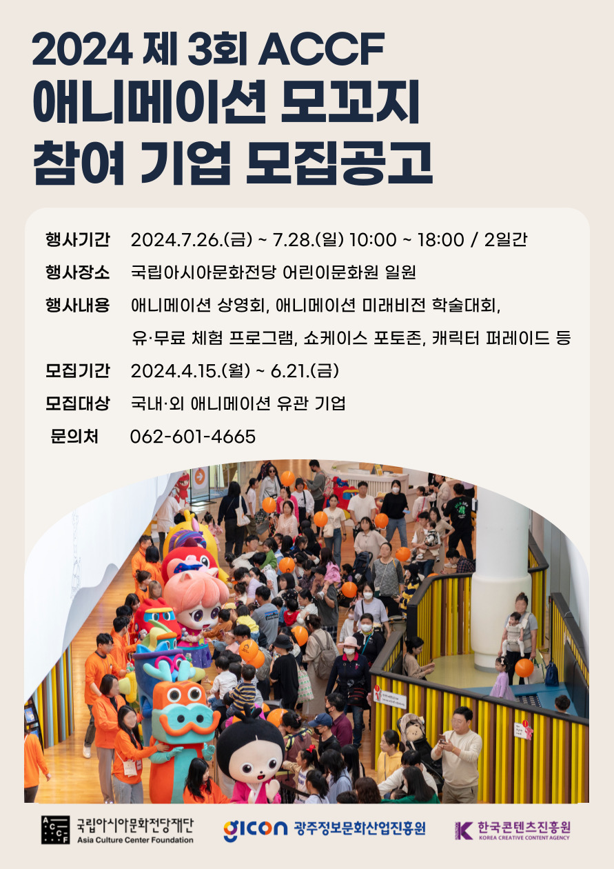 7월 26일(금)~7월 28일(일) 국립아시아문화전당에서 진행되는 제3회 ACCF 애니메이션 모꼬지 행사 참가기업을 모집합니다. 애니메이션 모꼬지는 국내 최대의 문화기관인 국립아시아문화전당에서 우수한 애니메이션 콘텐츠를 선보이고, 관람객이 즐길 수 있는 프로그램과 이벤트를 제공하는 고객지향형 애니메이션 쇼케이스 행사입니다. 여러분의 소중한 작품이 관람객이자 예비 시청자에게 사랑받는 모습을 눈으로 확인하실 수 있는 좋은 기회가 될 것입니다. - 행사기간: 2024. 7. 26.(금) ~ 28.(일) 10시~18시 - 행사장소: 국립아시아문화전당 어린이문화원, 문화정보원 일원 - 행사내용: 애니메이션 미래비전포럼, 애니메이션 상영회, 작품 쇼케이스, 체험 프로그램, 캐릭터 퍼레이드 등 - 공동주관: 국립아시아문화전당재단, 광주정보문화산업진흥원, 한국콘텐츠진흥원 - 담당자 연락처: 국립아시아문화전당재단 문화유통팀 유승재 / 062-601-4665 / acm@accf.or.kr