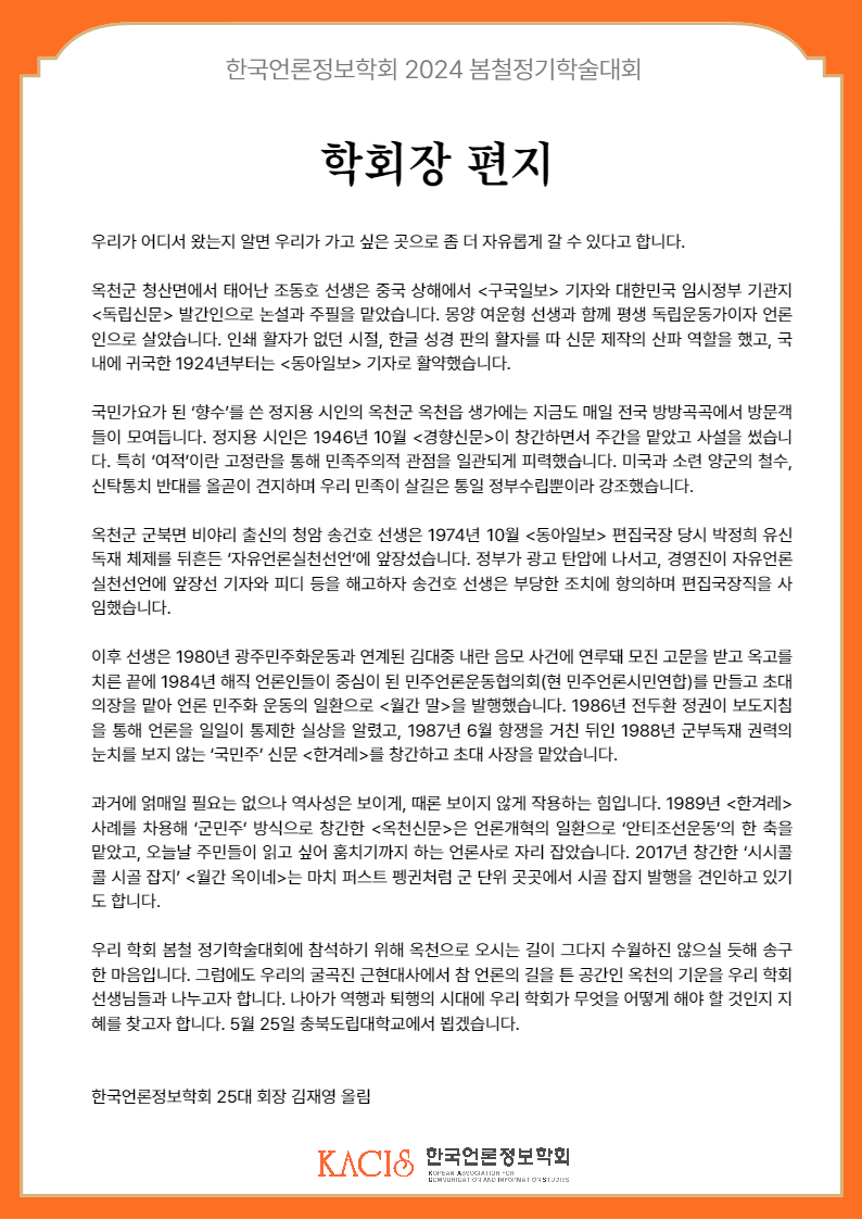 2024 봄철정기학술대회 학회장 편지
