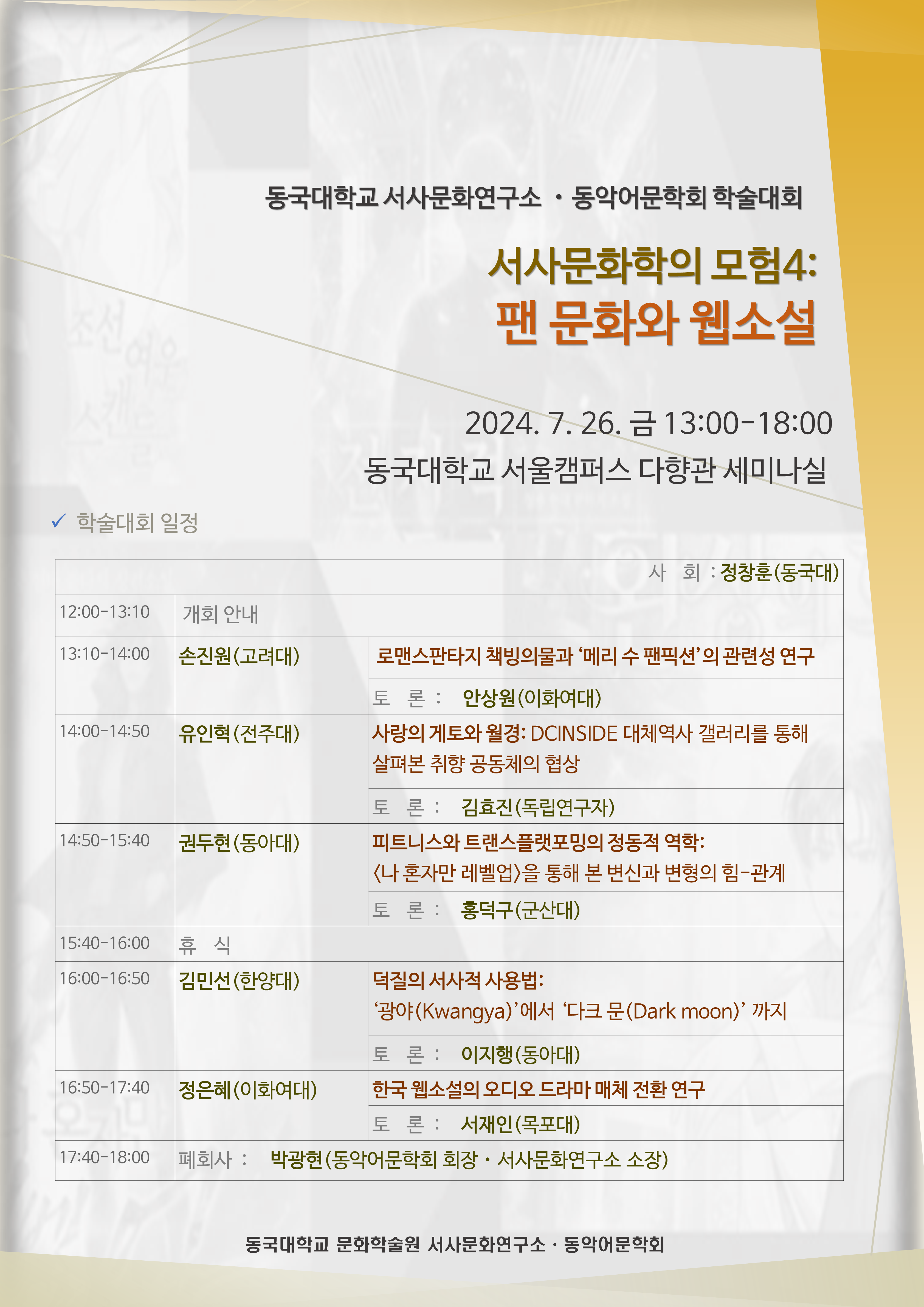 동악어문학회와 동국대학교 서사문화연구소는 2024년 7월 26일에 ‘팬 문화와 웹소설’이라는 주제로 학술대회를 개최합니다.