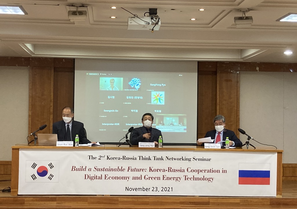 그 두 번째 행사로 러시아학술원 산하 경제연구소 (IE RAS)와 공동으로  '한러 디지털 경제 협력과 신재생에너지 '라는 주제로 세미나를 진행하였다 . 11월  23(), 한국외대 교수회관  2층 대강연실에서 진행된 이번 학술 컨퍼런스는 러시아와 한국 간의 디지털 분야와 신재생에너지 부문의 협력을 증진하고 앞으로 발전된 협력 방법을 찾아보자는 내용으로  2세션에 걸쳐  14명의 러시아와 한국의 전문가들이 참여하였다 .