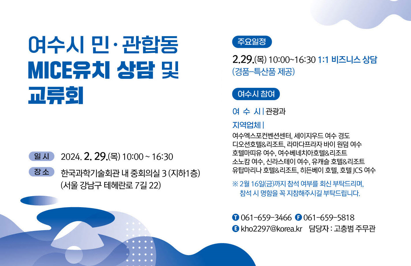 2. 여수시청에서 여수시 민관합동 MICE 유치 상담 및 교류회 개최알림 및 홍보, 참여 요청을 다음과 같이 안내하오니, 회원 여러분의 많은 관심을 부탁드립니다. 감사합니다.