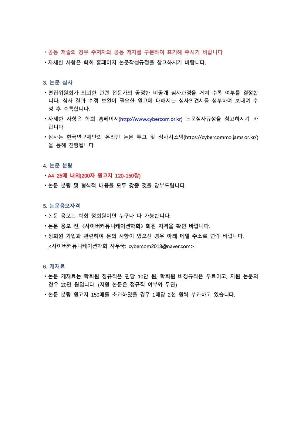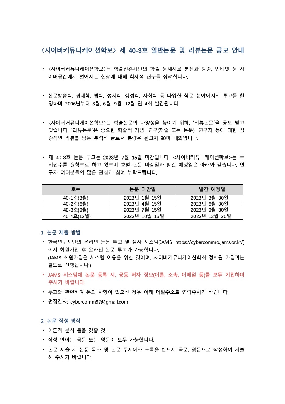 2. 한국언론정보학회는 사이버커뮤니케이션학회의 '사이버커뮤니케이션학보 40-3호 논문 공모'를 안내하오니, 회원 여러분의 많은 관심과 참여를 부탁드립니다.