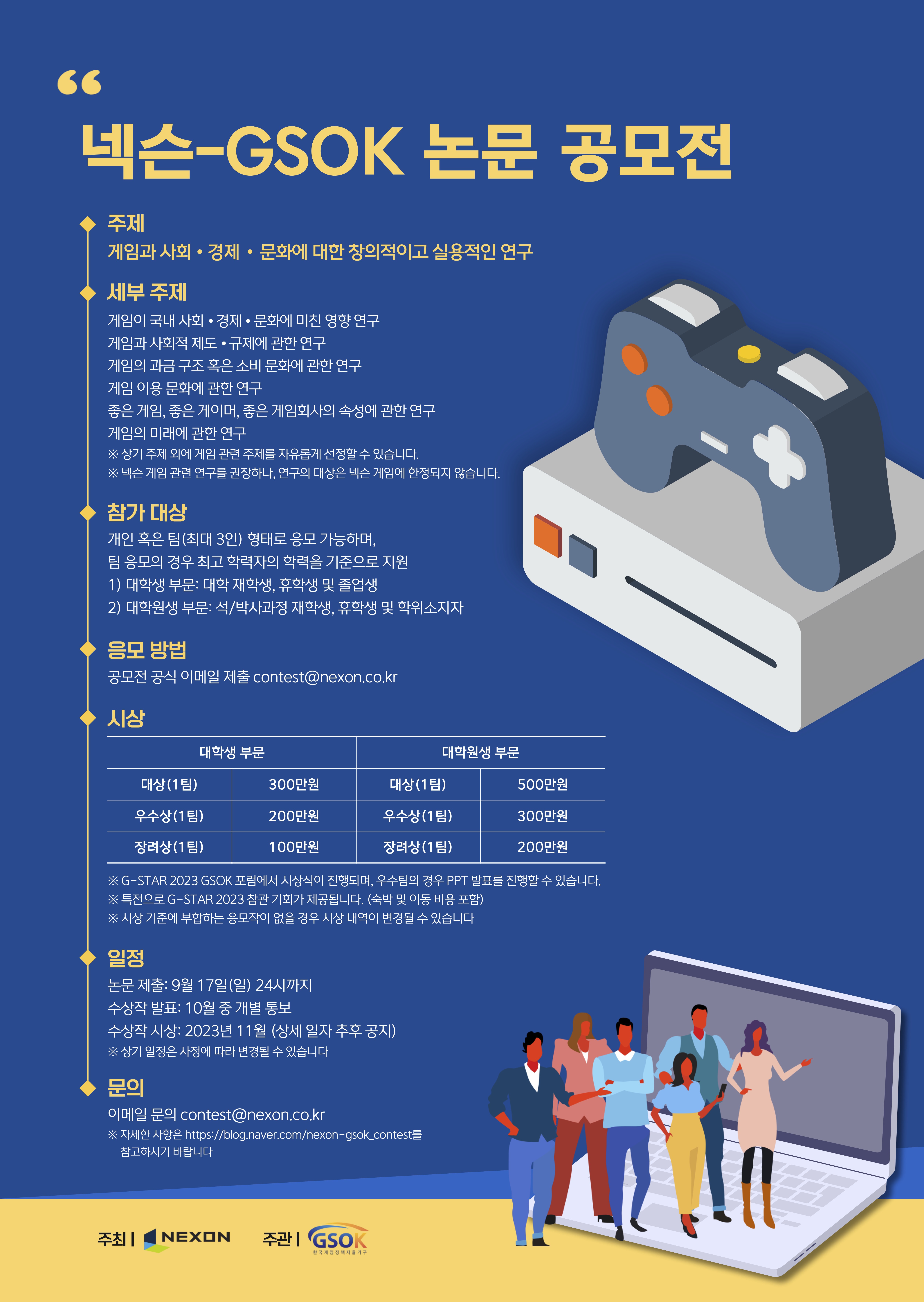 ※ 공모일정 등 자세한 사항은 공모전 홈페이지 (http://blog.naver.com/nexon-gsok_contest)를 참고해 주시기 바랍니다.