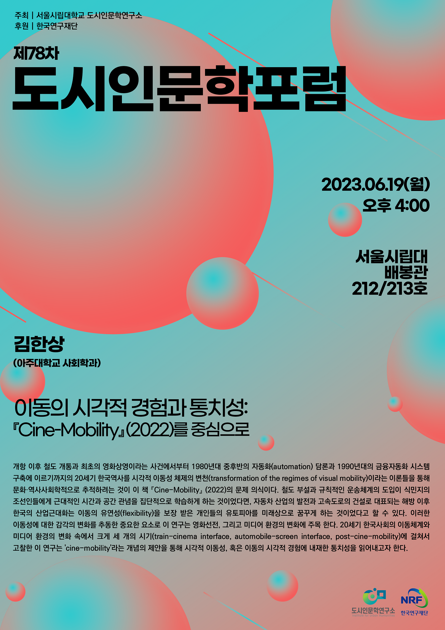 도시인문학연구소는 ‘디지털폴리스의 인문적 비전’이라는 주제 하에 한국연구재단 인문사회연구소 사업을 수행하고 있습니다. 그 일환으로 아주대 사회학과의 김한상 교수님을 모시고 “이동의 시각적 경험과 통치성: 『Cine-Mobility』(2022)를 중심으로”라는 주제의 포럼을 마련했습니다.