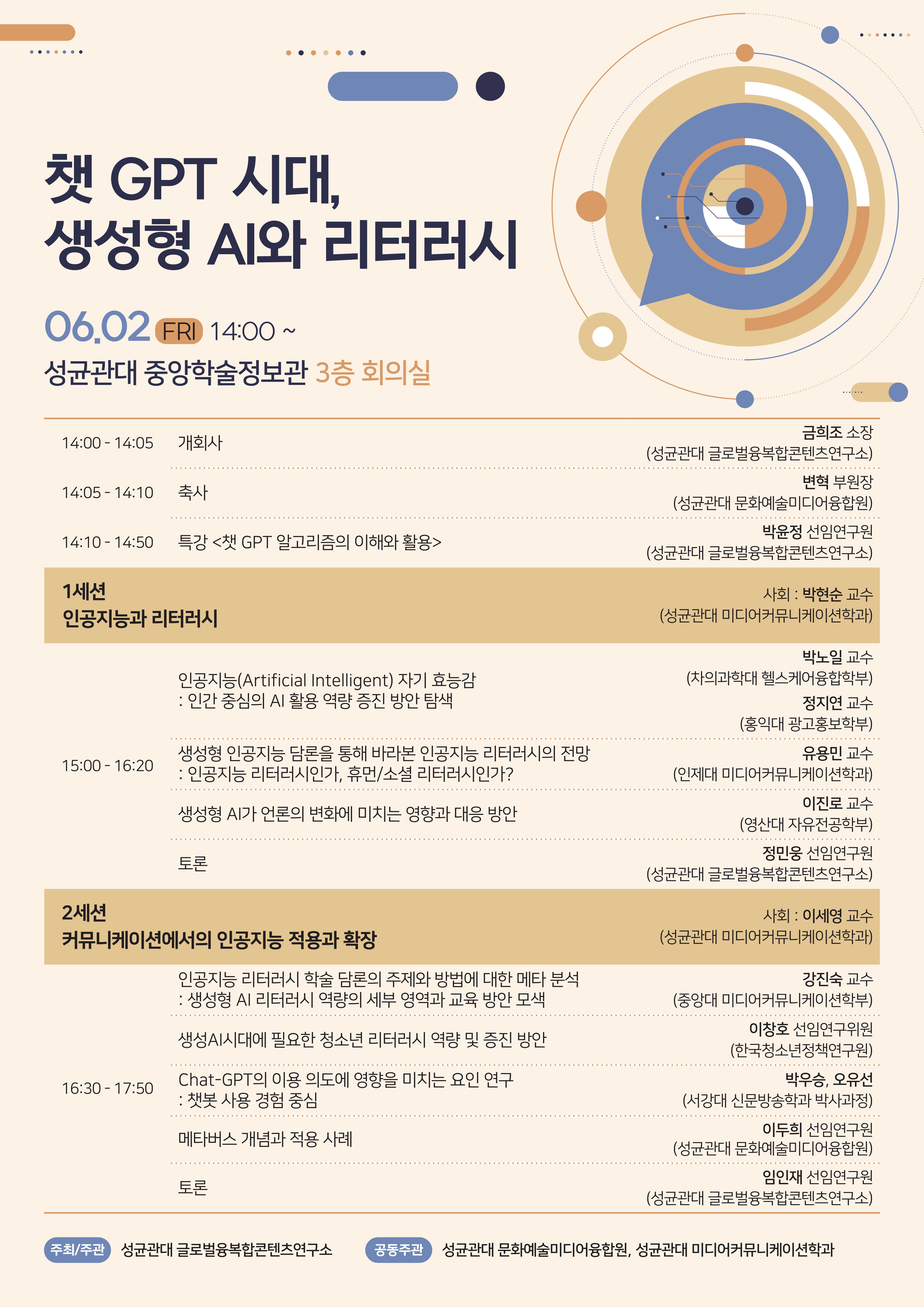 2. 한국언론정보학회는 성균관대학교 글로벌융복합콘텐츠연구소에서 주관하는 ‘챗 GPT 시대, 생성형 AI와 리터러시 학술대회’를 안내하오니, 회원 여러분의 많은 관심과 참여를 부탁드립니다.