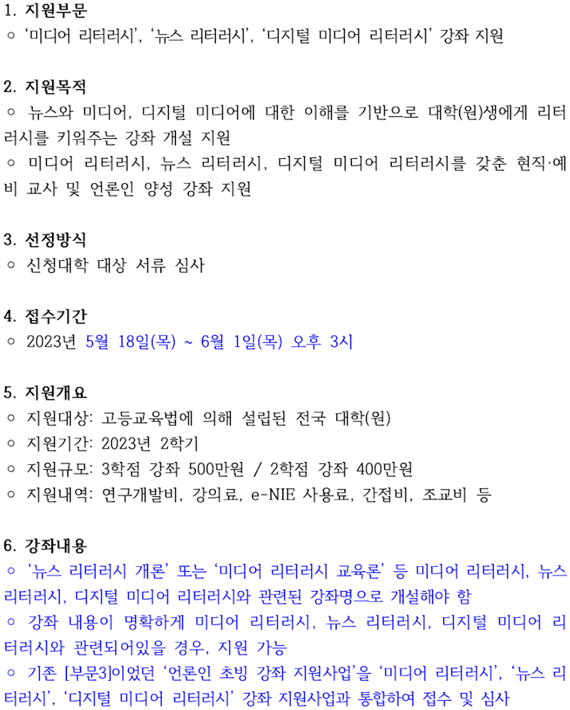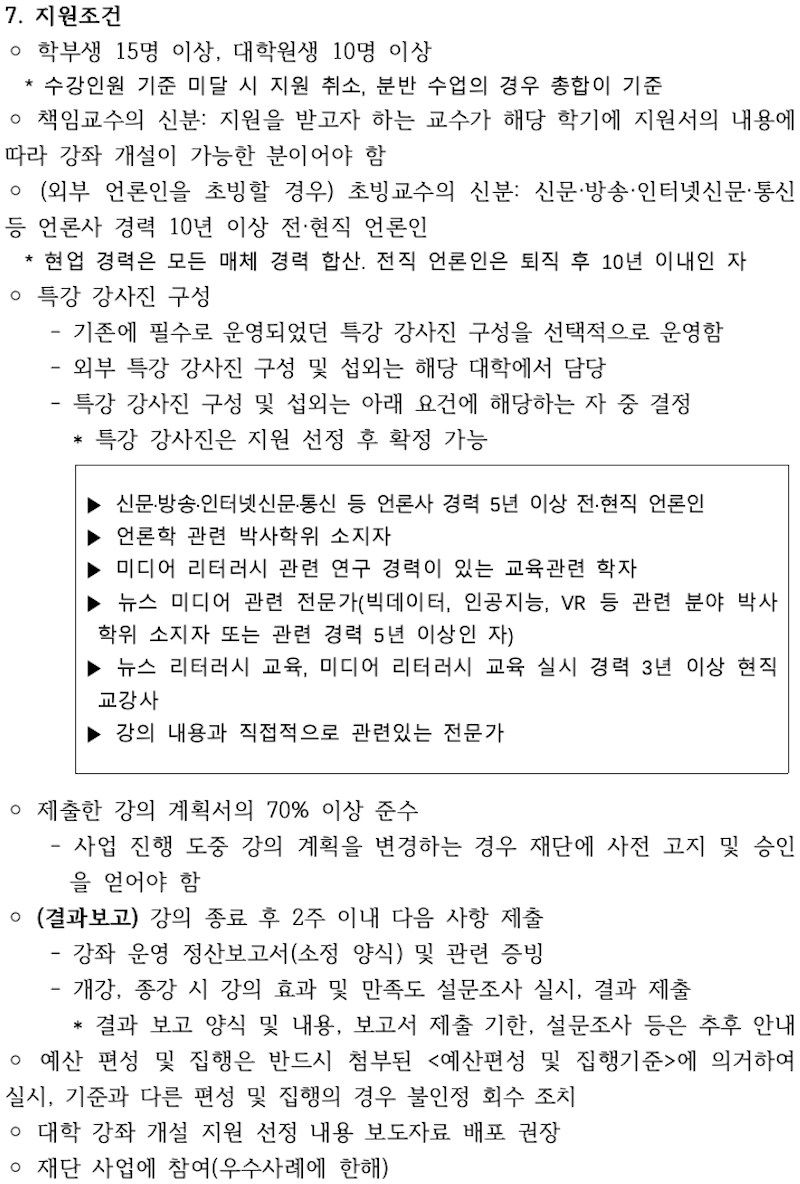 한국언론진흥재단은 대학(원)생들의 뉴스 리터러시 와 언론 환경에 대한 이해도 제고를 위해‘미디어(또는 뉴스, 디지털 미디어) 리터러시’강좌를 지원합니다. 관심 있는 대학들의 많은 신청 바랍니다.