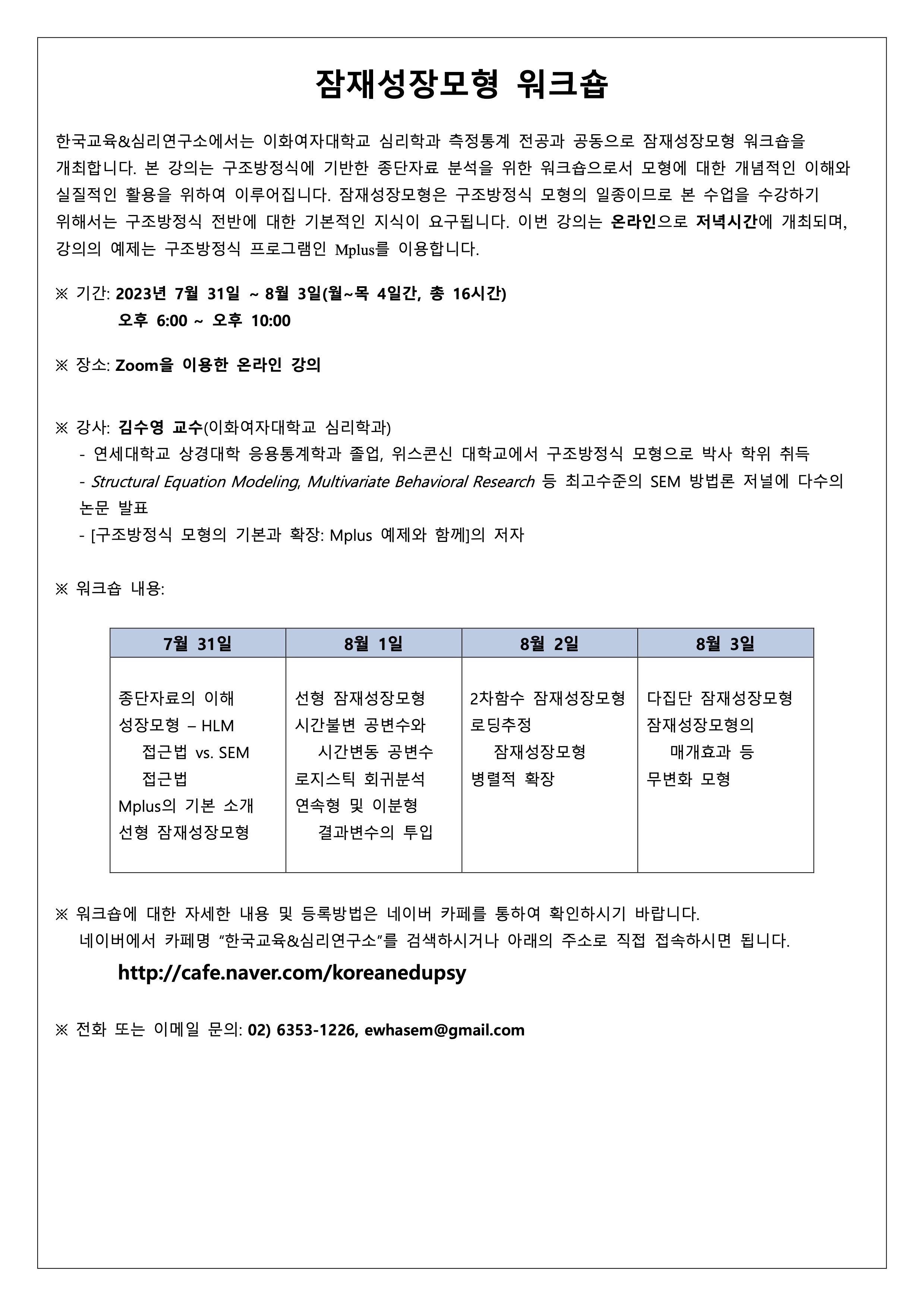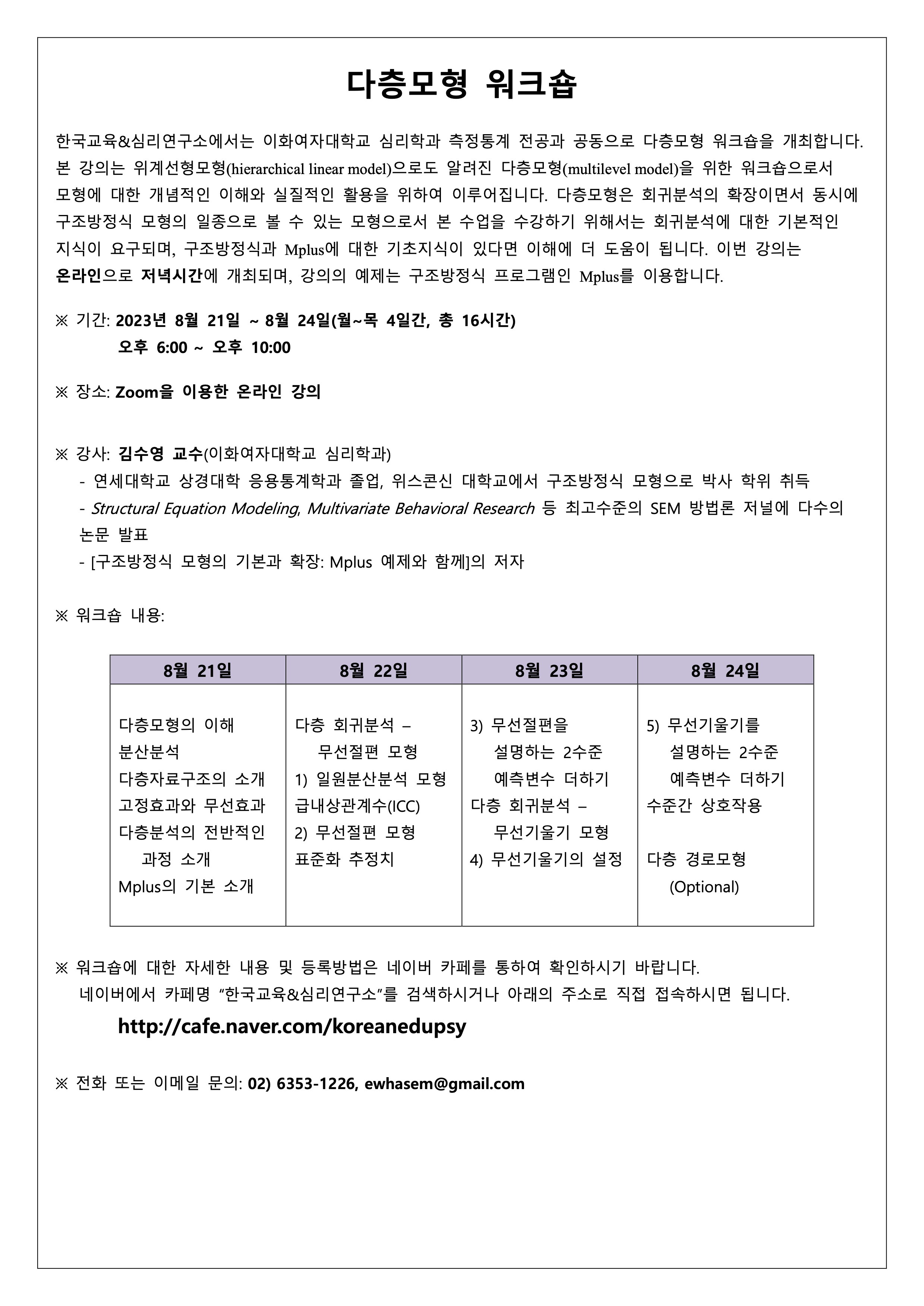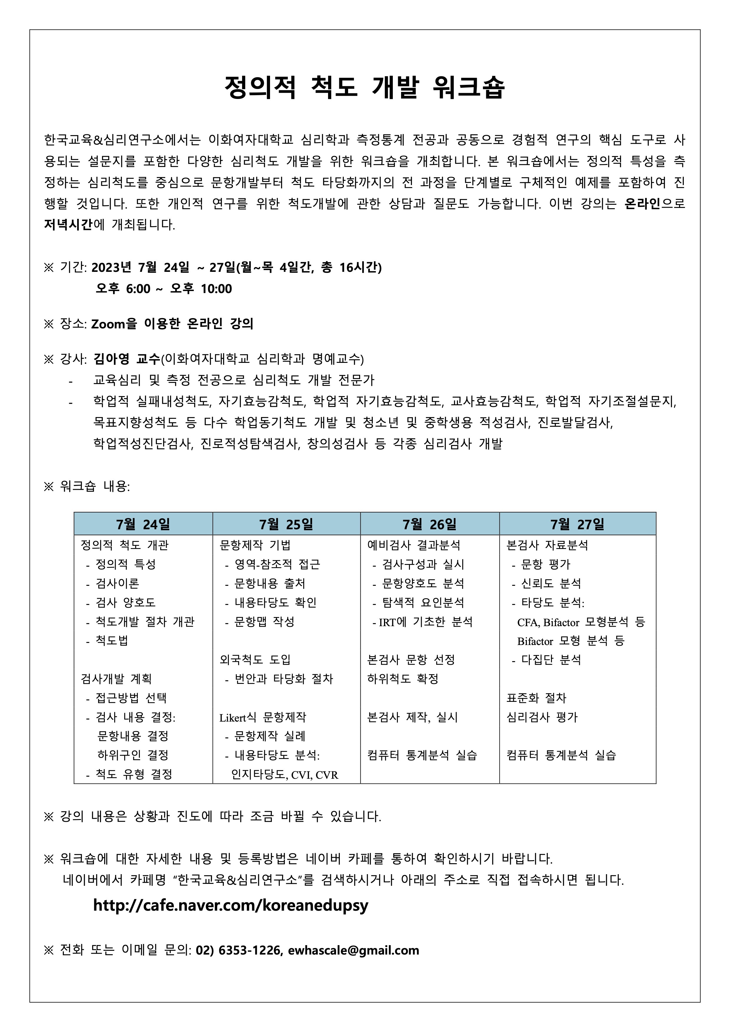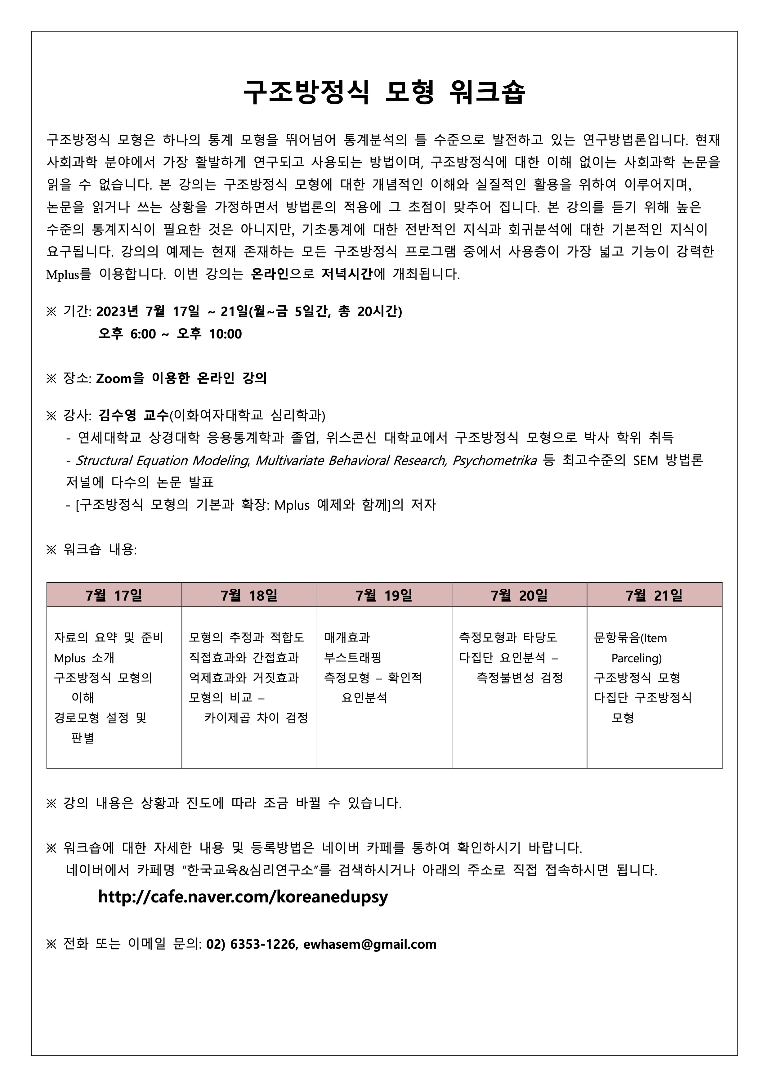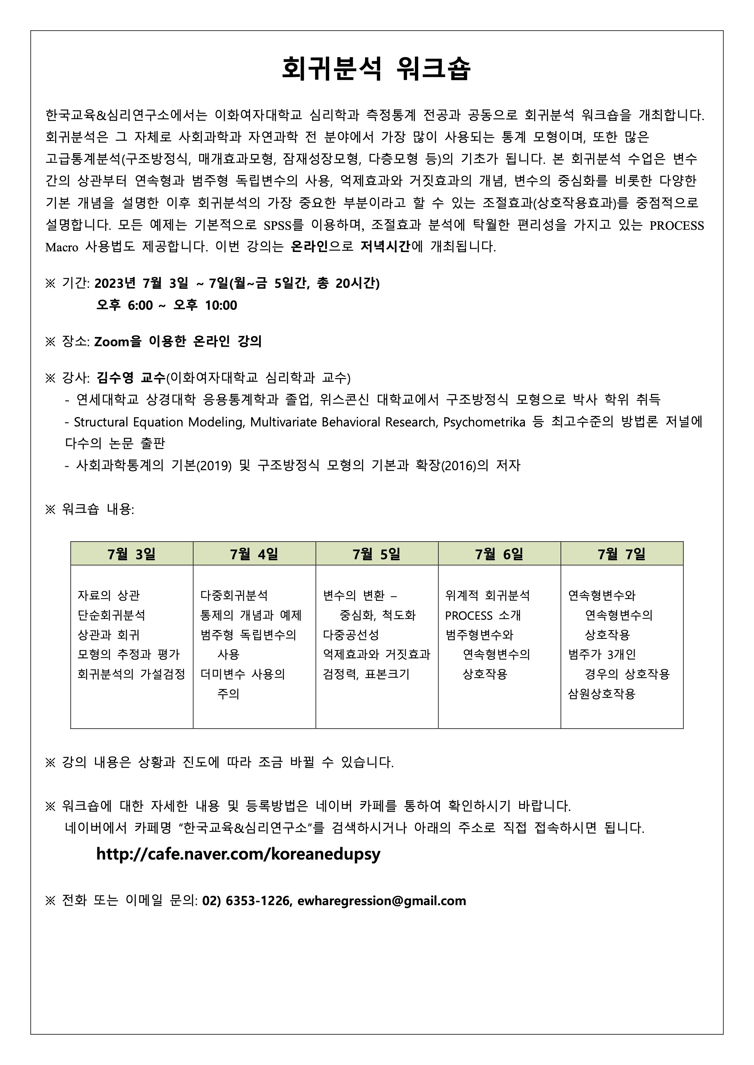 2. 한국언론정보학회는 이화여자대학교 심리측정통계연구실 워크숍을 안내하오니, 회원 여러분의 많은 관심과 참여를 부탁드립니다.