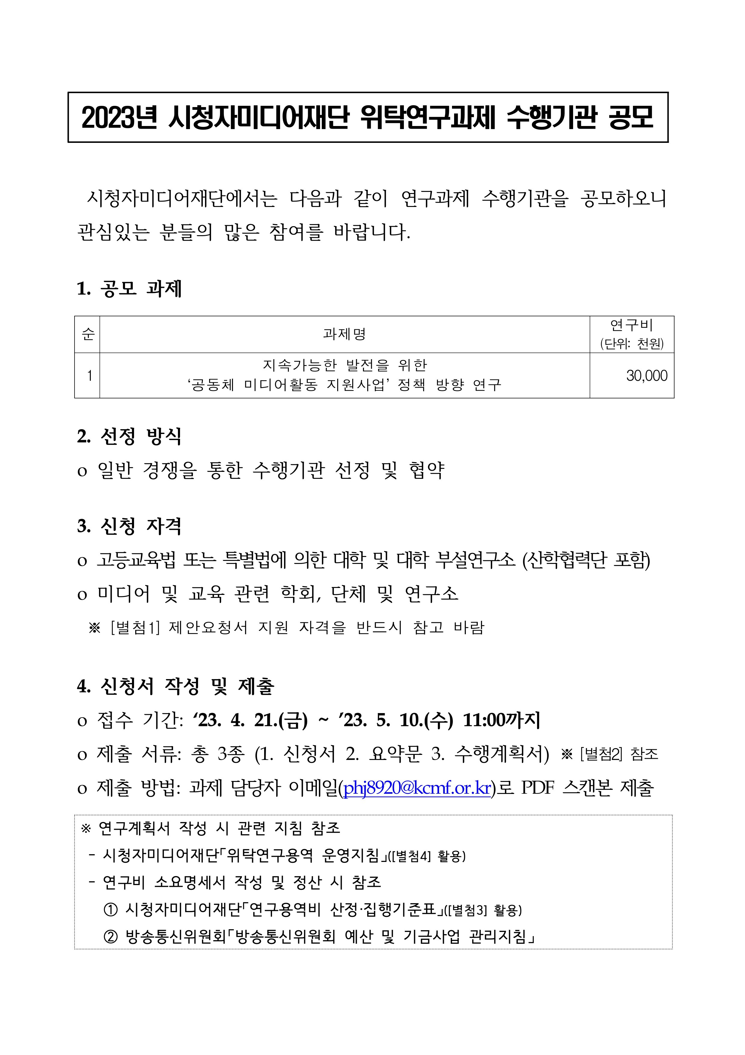 2023년 시청자미디어재단 위탁연구과제 수행기관 공모