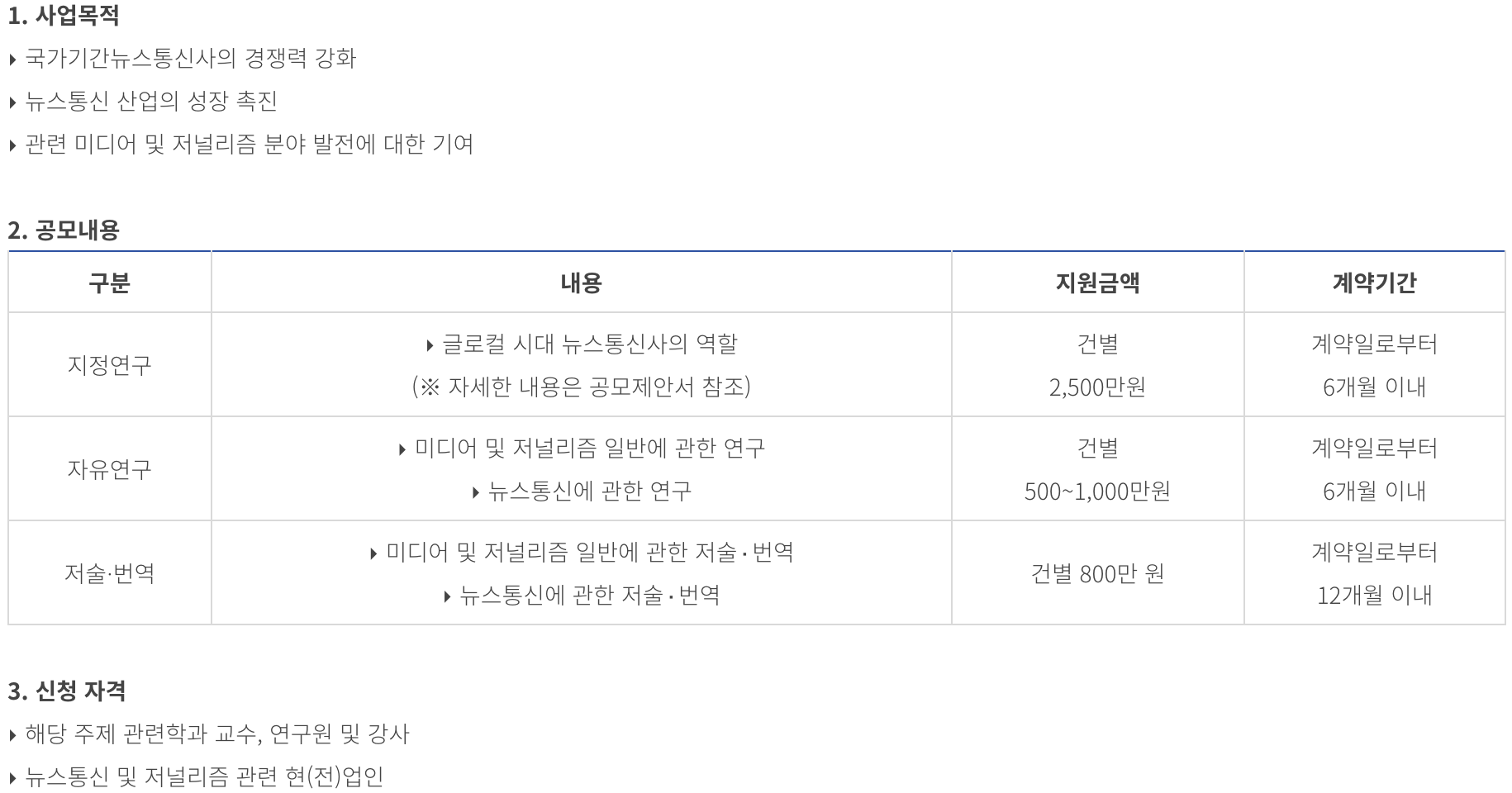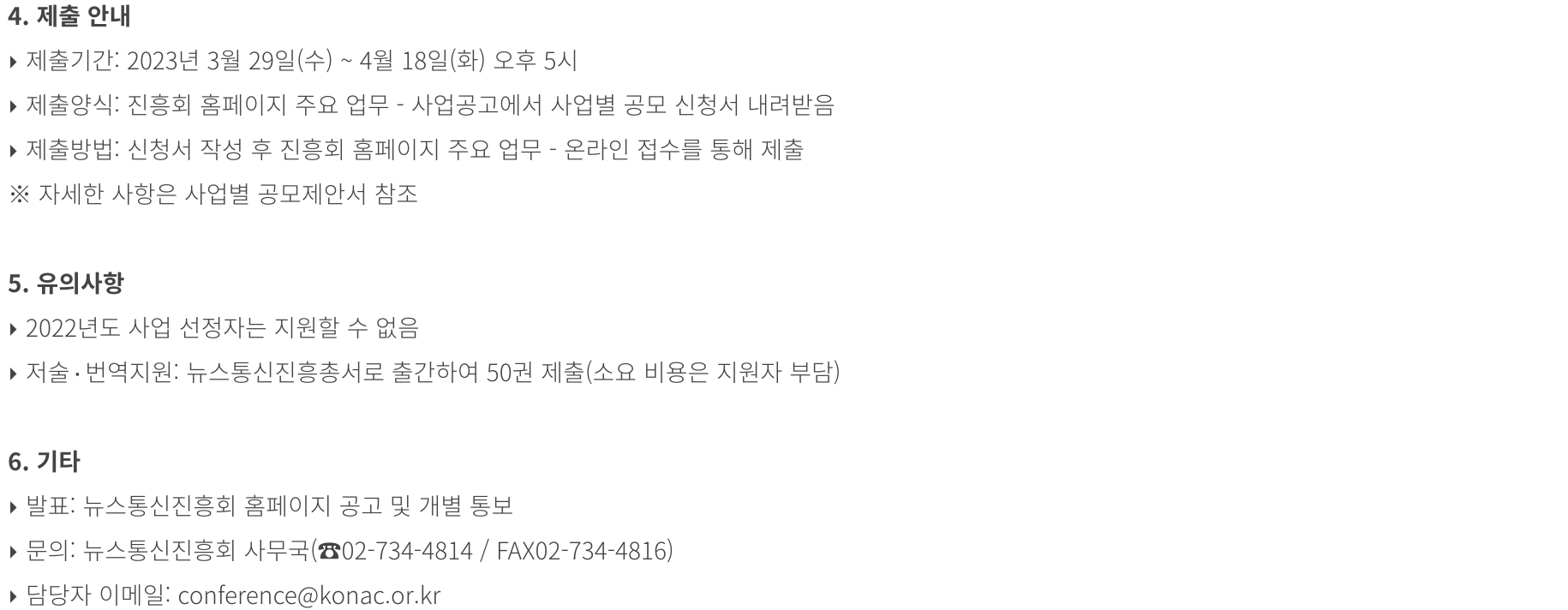 뉴스통신진흥회에서는 2023년 연구학술사업 계획을 아래와 같이 공고하니 관심 있는 기관 및 전문가의 많은 응모 바랍니다.