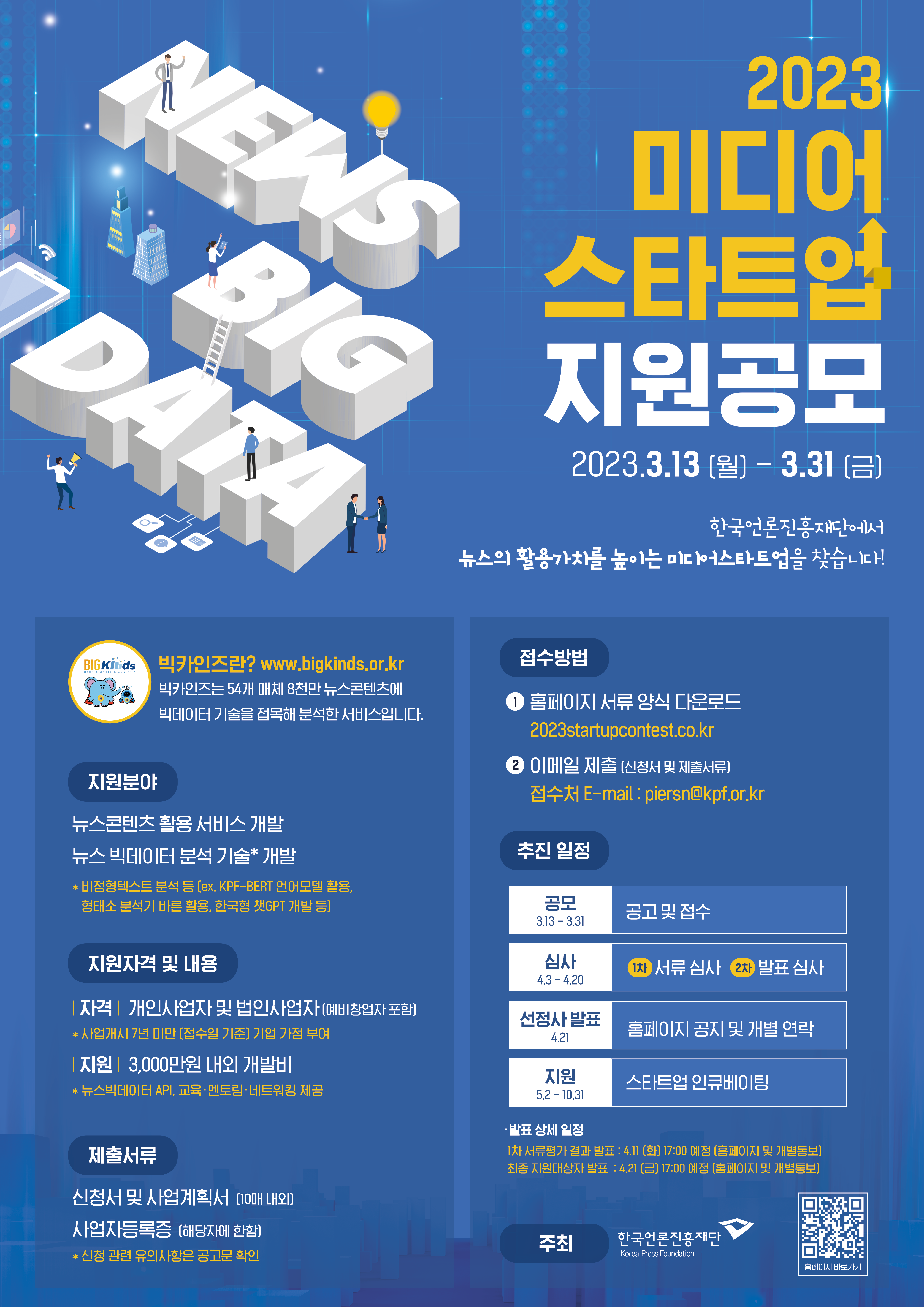 한국언론진흥재단에서는 뉴스 콘텐츠의 활용가치를 높일 수 있는 다양한 사업 아이디어 지원을 위해 『2023년 미디어 스타트업 지원 사업』을 진행합니다.