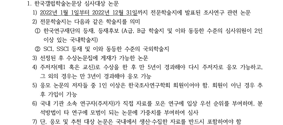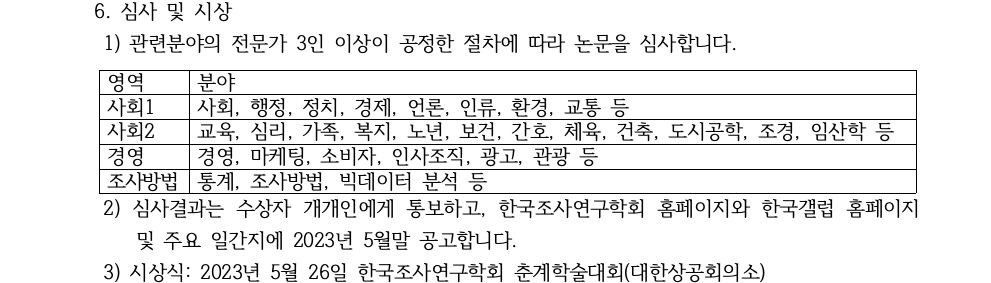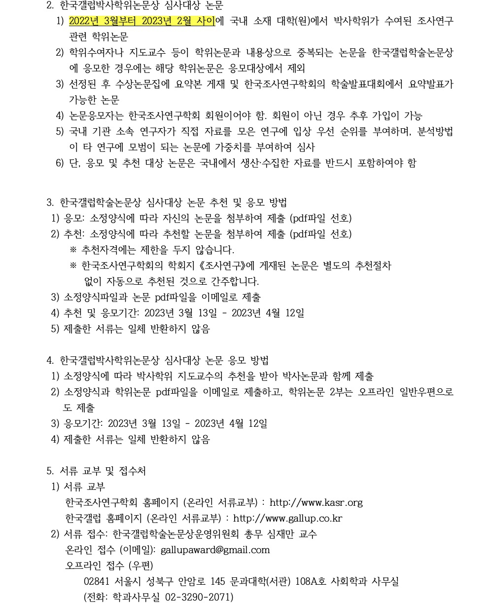2. 한국언론정보학회는 한국조사연구학회의 한국갤럽학술논문상 및 한국갤럽박사학위논문상 추천 및 응모를 안내하오니, 회원 여러분의 많은 관심과 참여를 부탁드립니다. 감사합니다.
