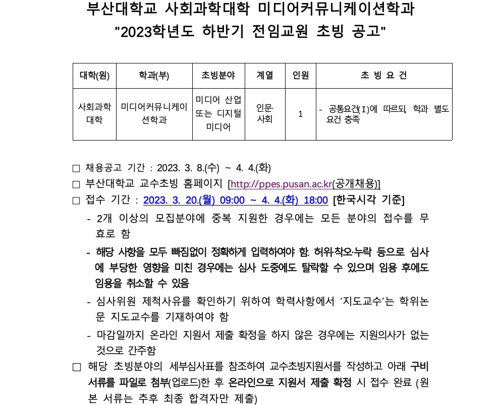 2. 한국언론정보학회는 부산대학교 미디어영상학과의 2023학년도 하반기 전임교원 초빙 공고를 안내하오니, 회원 여러분의 많은 관심과 참여 부탁드립니다. 감사합니다.