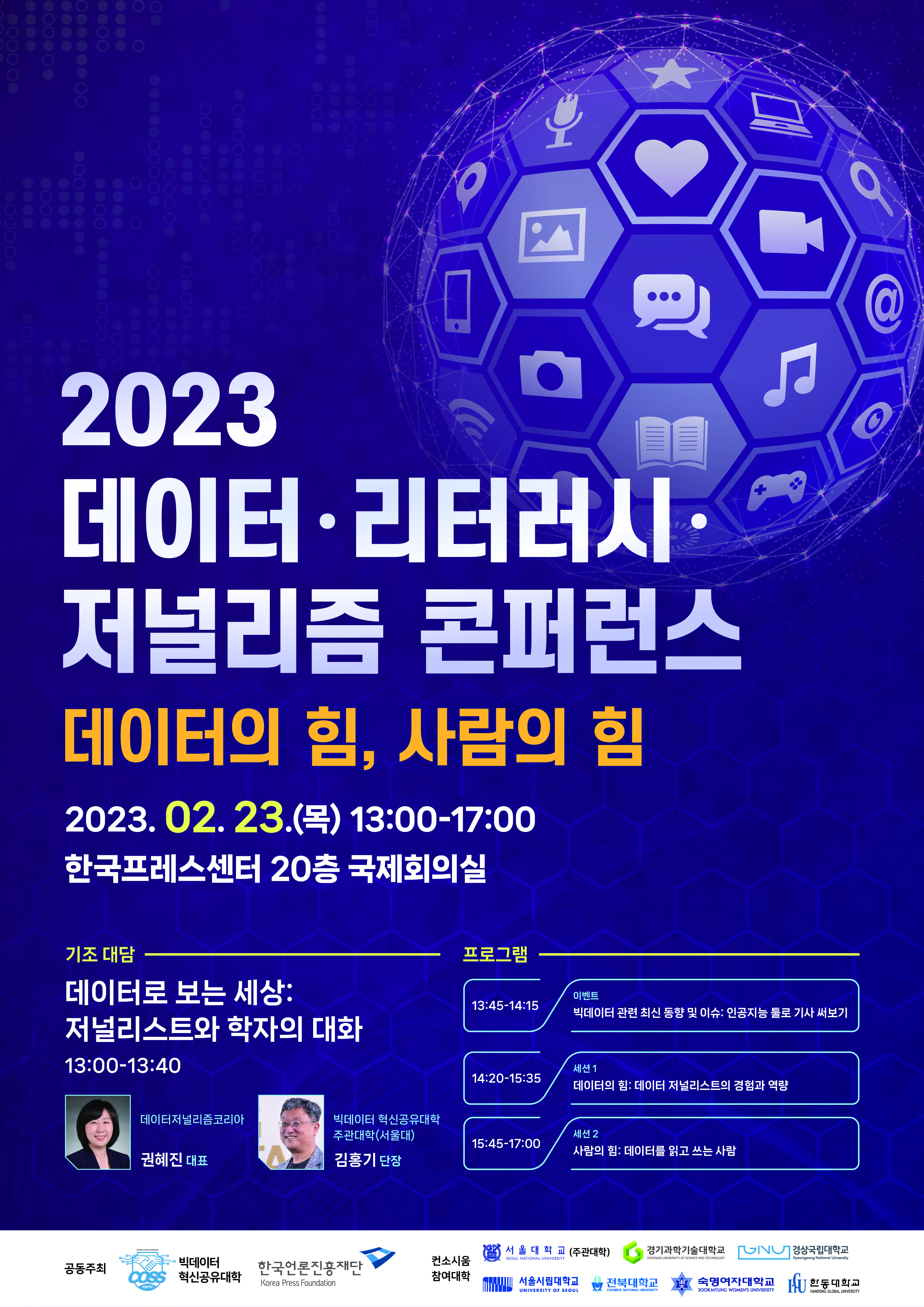 서울대학교 빅데이터 혁신공유대학과 한국언론진흥재단은 <데이터, 리터러시, 저널리즘> 콘퍼런스 '데이터의 힘, 사람의 힘'을 공동개최합니다. 데이터를 읽고 쓰는 전문가들이 모여 현재의 데이터와 사회, 그리고 우리가 데이터 사회를 살아감에 있어 필요한 '리터러시'를 논합니다. 챗GPT와 같은 인공지능 툴을 활용한 기사 작성 시연 이벤트를 통해 일상에 성큼 들어온 데이터 기반 기술에 대해 이야기하는 자리도 마련되어 있으니 많은 관심과 참여 부탁드립니다.
