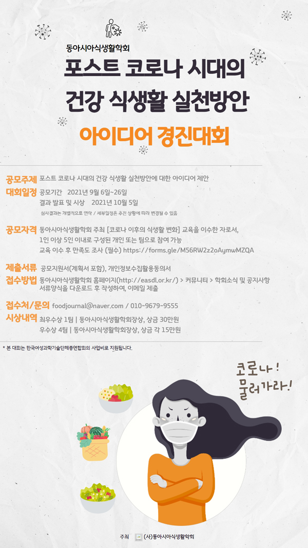본 학회에서 '포스트 코로나 시대의 건강 식생활 실천방안 아이디어 경진대회'를 실시하여 안내합니다.