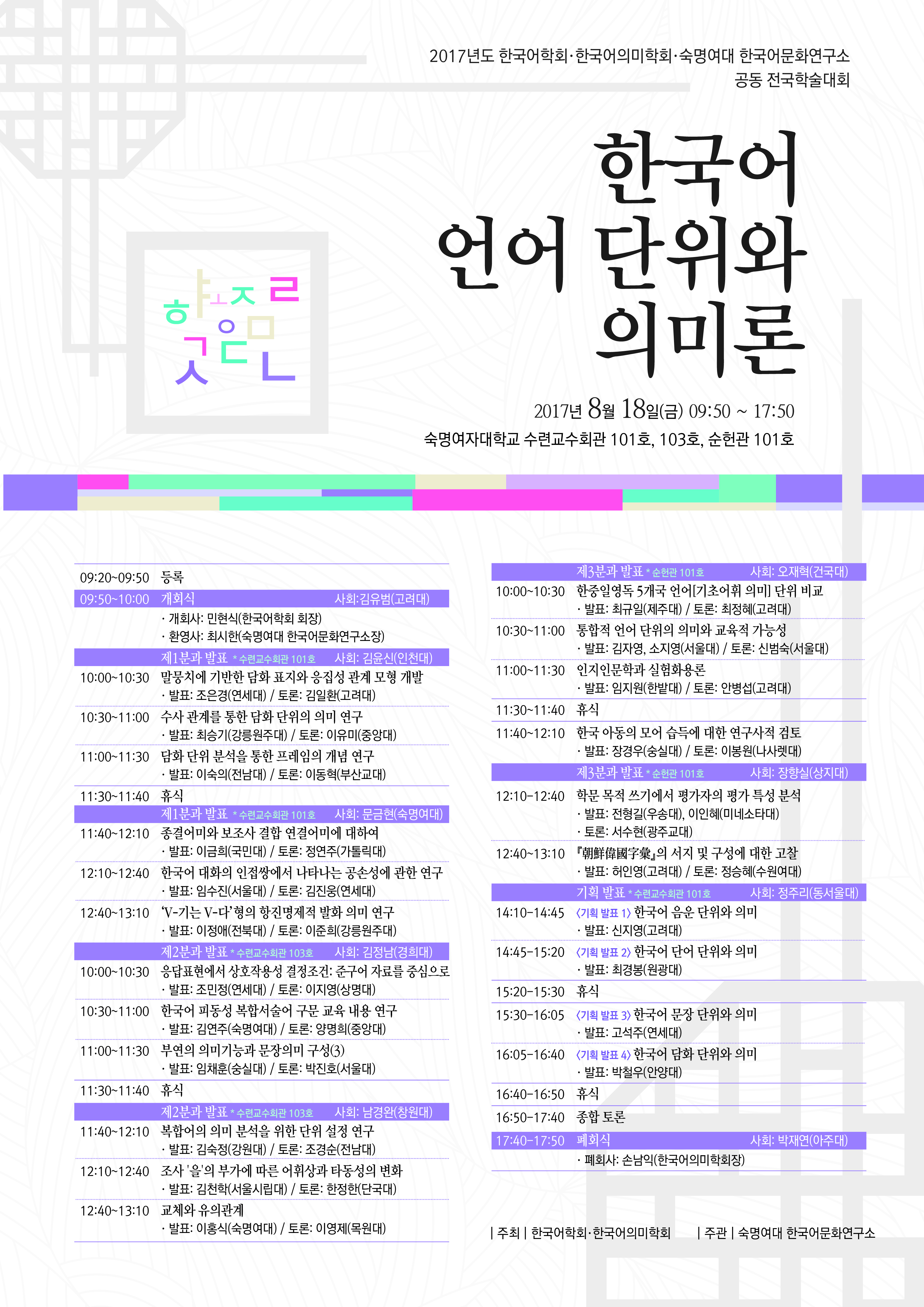 2017년도 한국어학회, 한국어의미학회, 숙명여대 한국어문화연구소 공동 전국학술대회 개최 안내