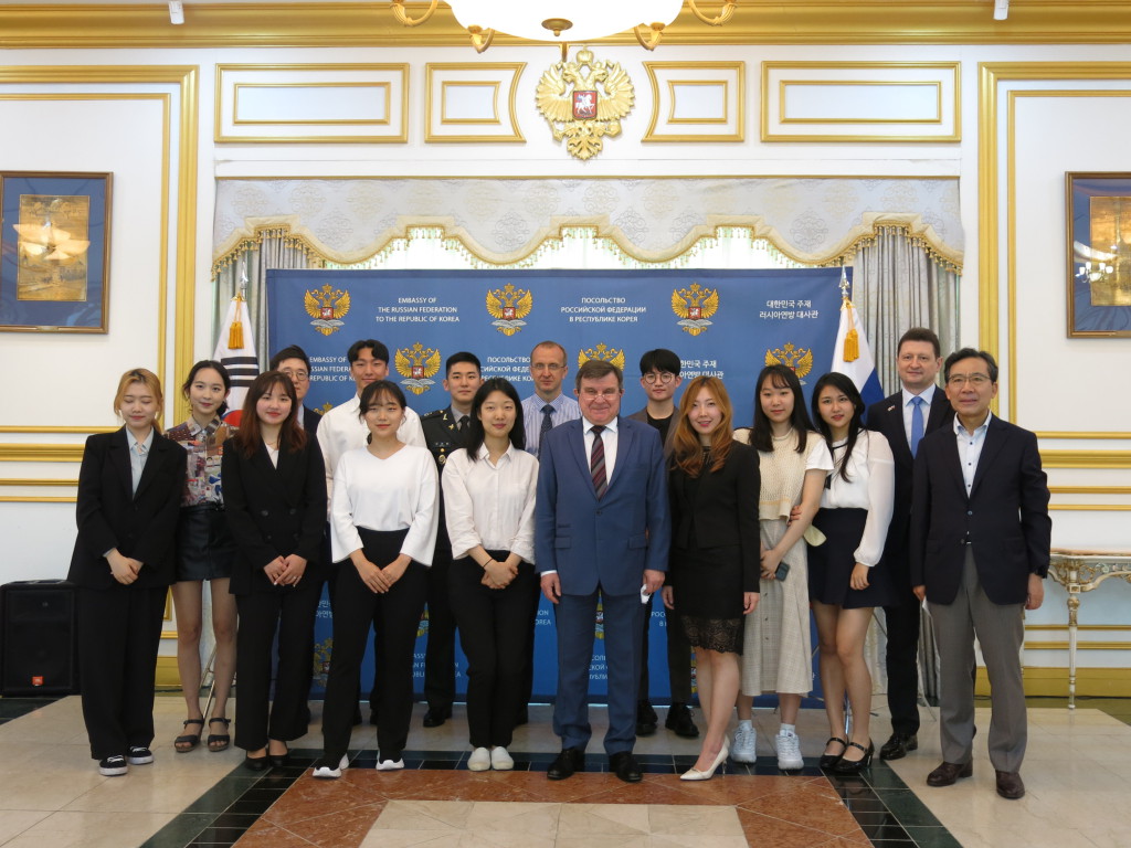 (사진 ) 2021년  6월  4일 주한러시아대사관에서 열린 제 11회 러시아어 토론대회 시상식이 끝난 뒤 수상자들이 주한 러시아 대사를 비롯한 대회 관계자들과 단체로 기념촬영을 하고 있다 .