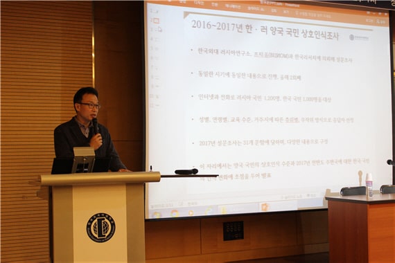 최우익 HK교수는 1세션에서 ‘2017년 한·러 양국 국민 상호인식조사한국 국민의 인식을 중심으로라는 주제를 발표했다한국외대 러시아연구소는 2016년에 이어 2017년에도 러시아여론조사센터(프치옴)와 한국리서치에 의뢰해 한국과 러시아 국민을 대상으로 설문조사를 벌였으며최우익 교수는 한국 국민의 인식을 중심으로그리고 같은 세션 안나 쿨레쇼바 프치옴 수석연구원은 러시아 국민의 인식을 중심으로 설문 결과를 발표했다설문 결과의 자세한 내용은 한국외대 러시아연구소 홈페이지에서 확인할 수 있다.