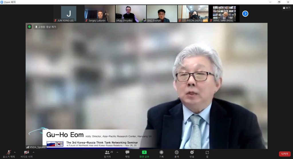 개회식에서 고재남 유라시아정책연구원장의 개회사 바실리 미헤예프 러시아 학술원 산하  IMEMO 부원장의 환영사 그리고 한양대 아태지역연구센터 엄구호 소장의 축사가 있었다 이어진 첫 번째 세션에서 세계화 시대의 새로운 양극성이 동북아와 한반도에 미치는 시사점에 대한 토의가 있었으며 미중대결시대에서 러일관계 전망과 동북아 및 한반도에 미치는 시사점에 대한 논의가 있었다 그리고 러시아의 확장된 유라시아 파트너십 정책과 비대면 시대 한러관계에 대한 발제가 있었다 두 번째 세션에서 러시아 북극개발 전략과 한러협력의 새로운 가능성과 디지털 무역협정 및 한 -EAEU 협력에 대하여 논의하였다 또한 동북아의 새로운 경제동향이 한러 관계에 미치는 영향과 북핵문제 해결방안에 대하여 러시아의 관점에서 토의하였다 .