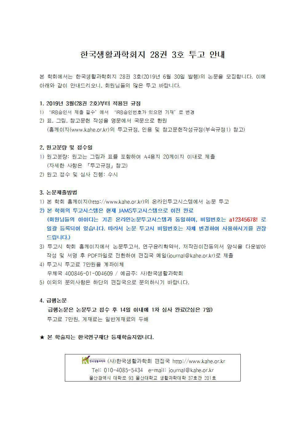 본 학회에서는 한국생활과학회지 28권 3호(2019년 6월 30일 발행)의 논문을 모집합니다. 이에 아래와 같이 안내드리오니, 회원님들의 많은 투고 바랍니다.
