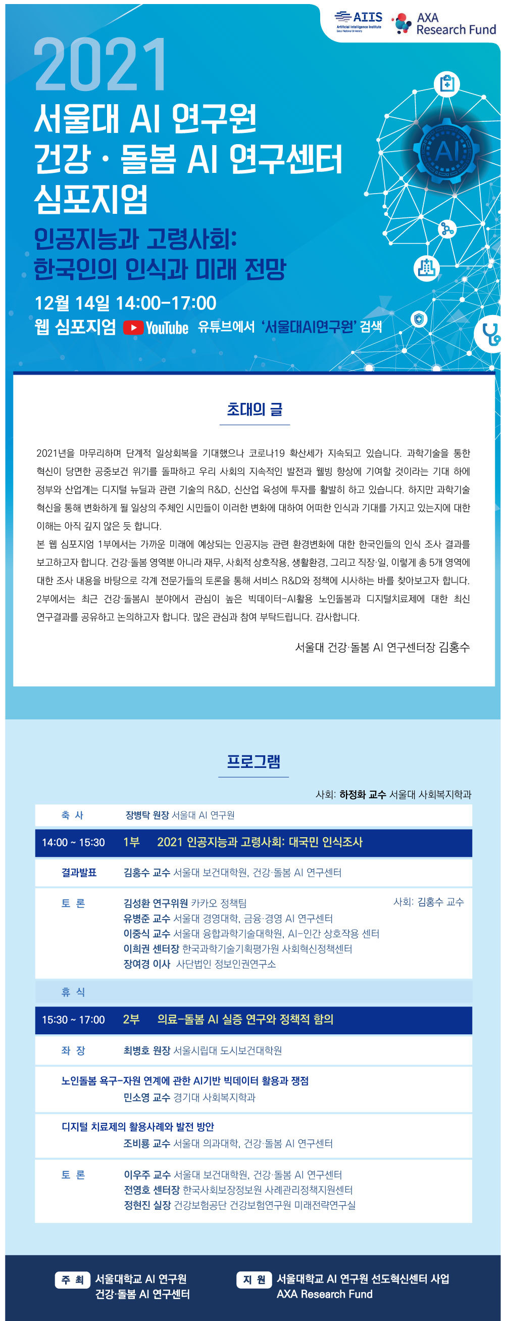 서울대학교 AI연구원에서 ‘ 2021 서울대 건강•돌봄 AI 연구센터 심포지엄’을 개최합니다.