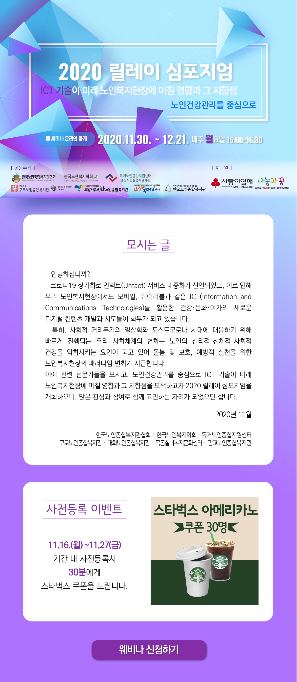 2020 릴레이 심포지엄 'ICT 기술이 미래 노인복지현장에 미칠 영향과 그 지향점' 개최 안내