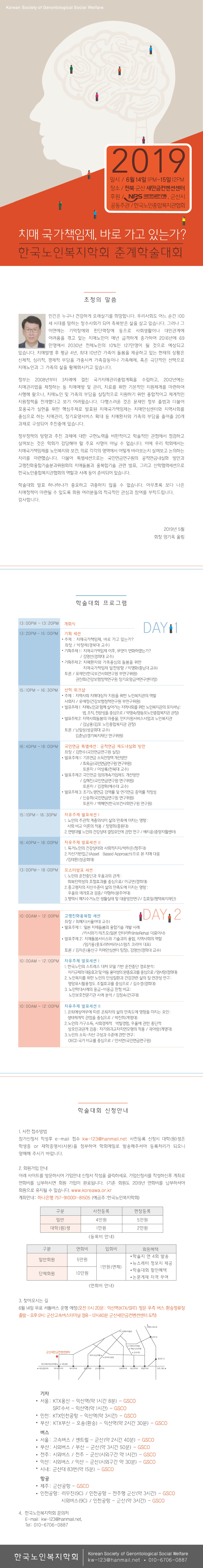 한국노인복지학회는 '치매국가책임제, 바로 가고 있는가'를 주제로 2019년 6월 14-15일 양일간 전북 군산새만금컨벤션센터에서 춘계학술대회를 개최합니다.