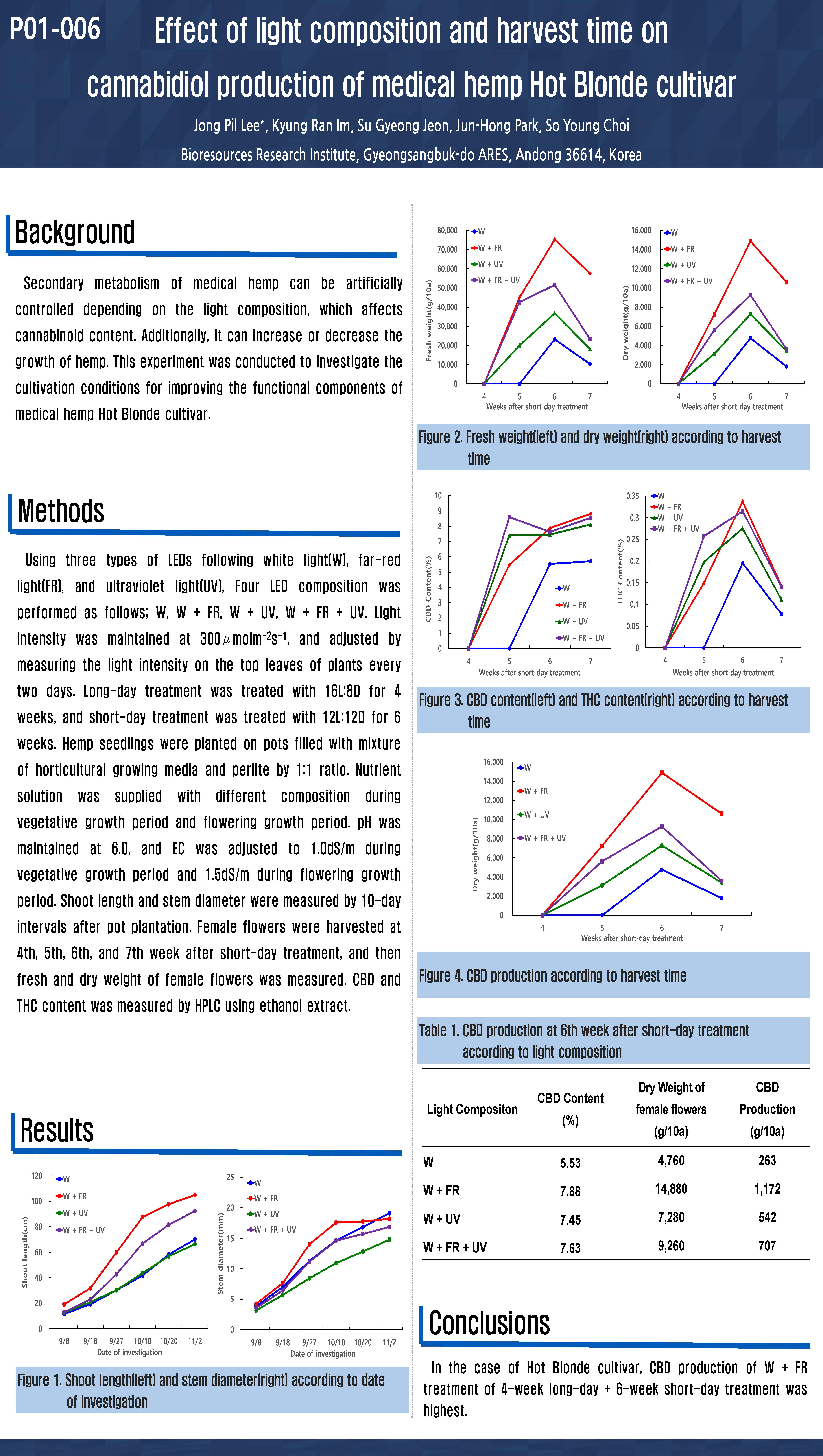 [P01-006] 광조성과 수확시기가 의료용 헴프 “핫블론드” 품종의 칸나비디올 생산에 미치는 영향