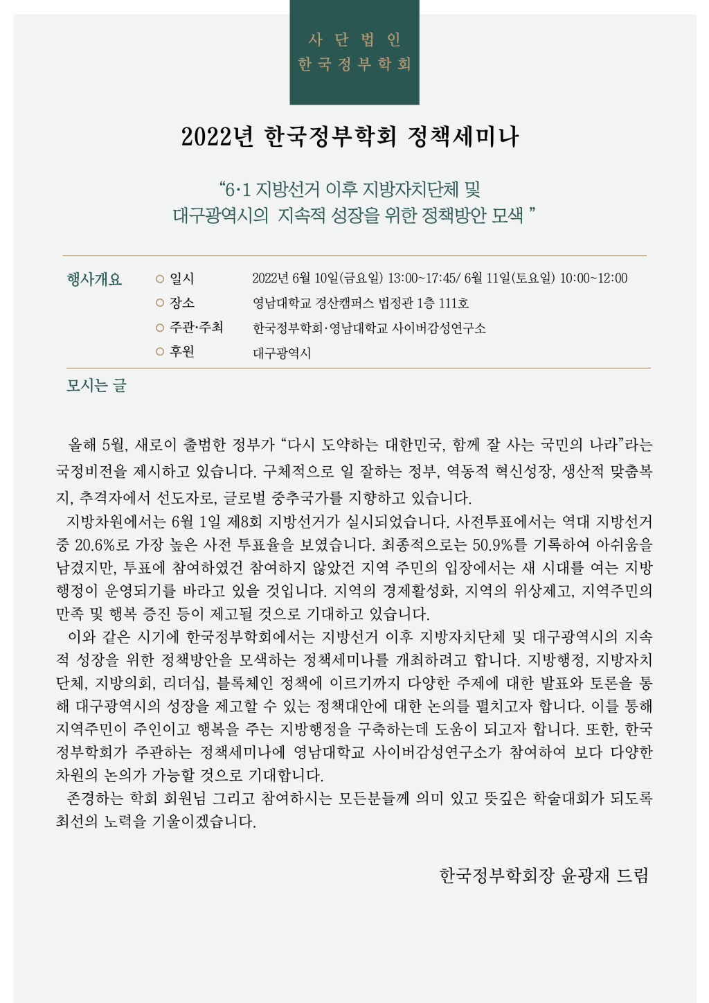 2022년 6월 10일-11일 한국정부학회 정책세미나 안내