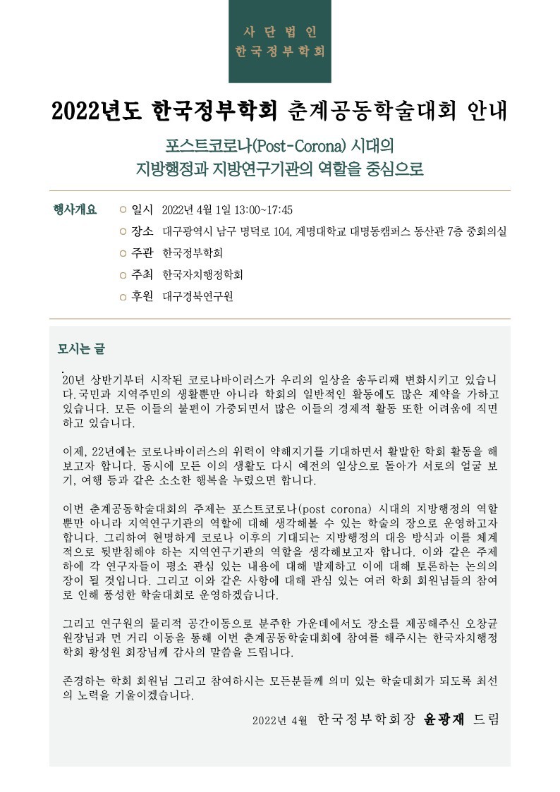 2022년 4월 1일 한국정부학회 춘계공동학술대회 안내