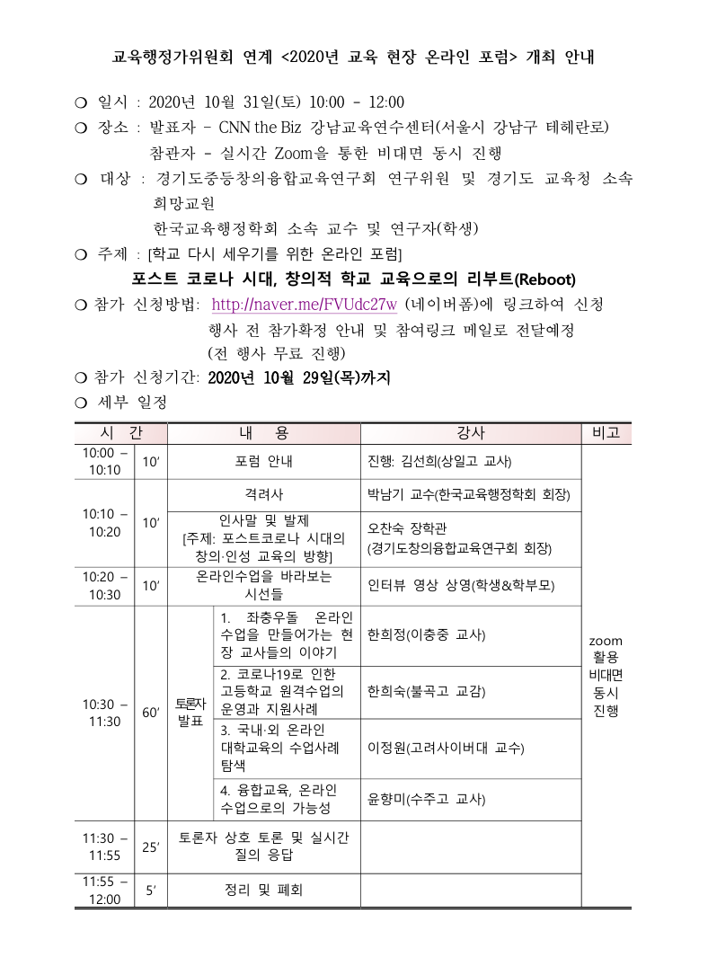 [한국교육행정학회] 교육행정가위원회 연계 <2020년 교육 현장 온라인 포럼> 개최 안내
