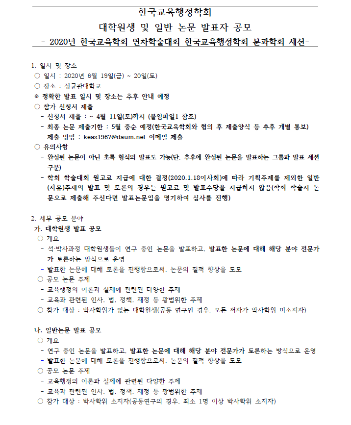 [연장 안내] 논문 발표자 공모: 2020년 한국교육학회 연차학술대회 한국교육행정학회 분과학회 세션(대학원생 및 일반연구자)