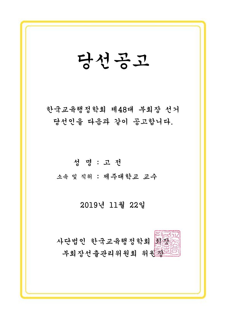 한국교육행정학회 제48대 부회장 선거 개표 결과, 제주대학교 고전 교수님께서 당선되셨습니다.