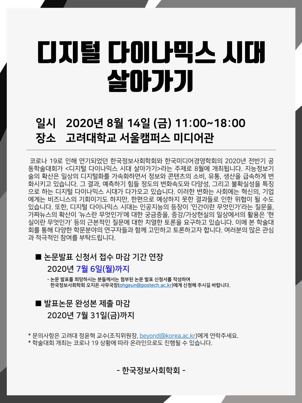 [한국정보사회학회] 2020년 전반기 정기학술대회 논문공모 기간연장 (신청서 접수 마감: ~7.6(월)까지)