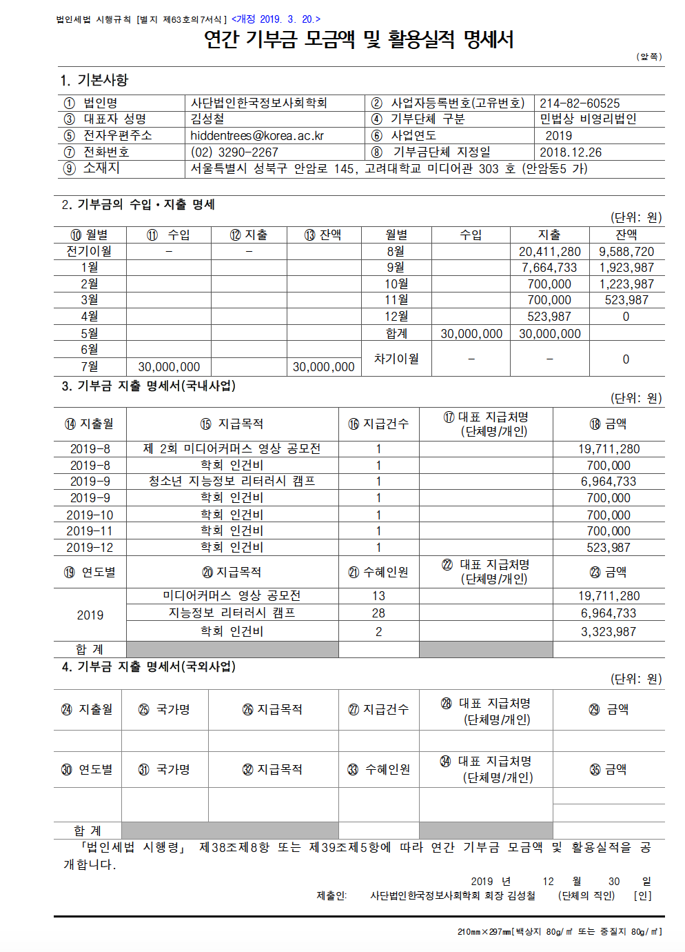 [한국정보사회학회] 2019년도 기부금 모금 및 활용실적