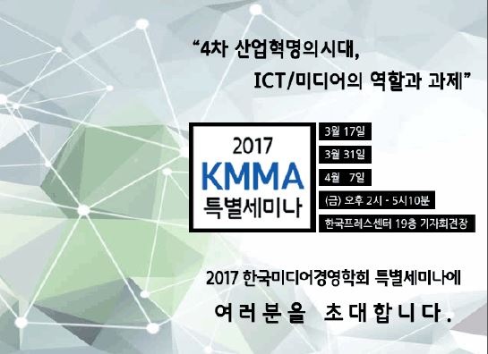 한국미디어경영학회는 오는 3월과 4월에 '한국미디어경영학회 특별세미나 시리즈'를 3회에 걸쳐 개최합니다.