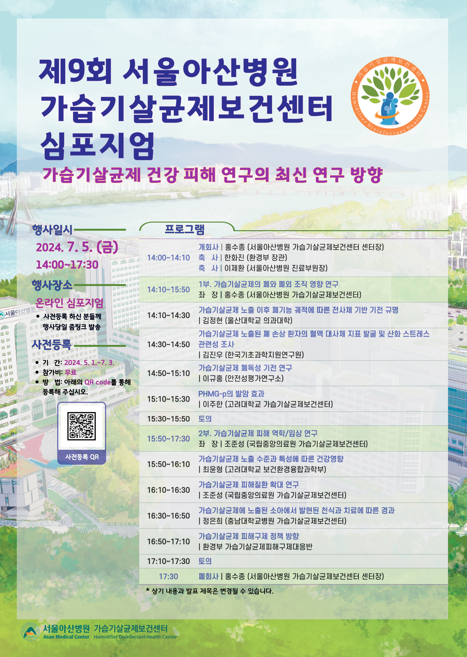 제9회 서울아산병원 가습기살균제보건센터 심포지엄 : 가습기살균제 건강피해의 최신 연구 방향