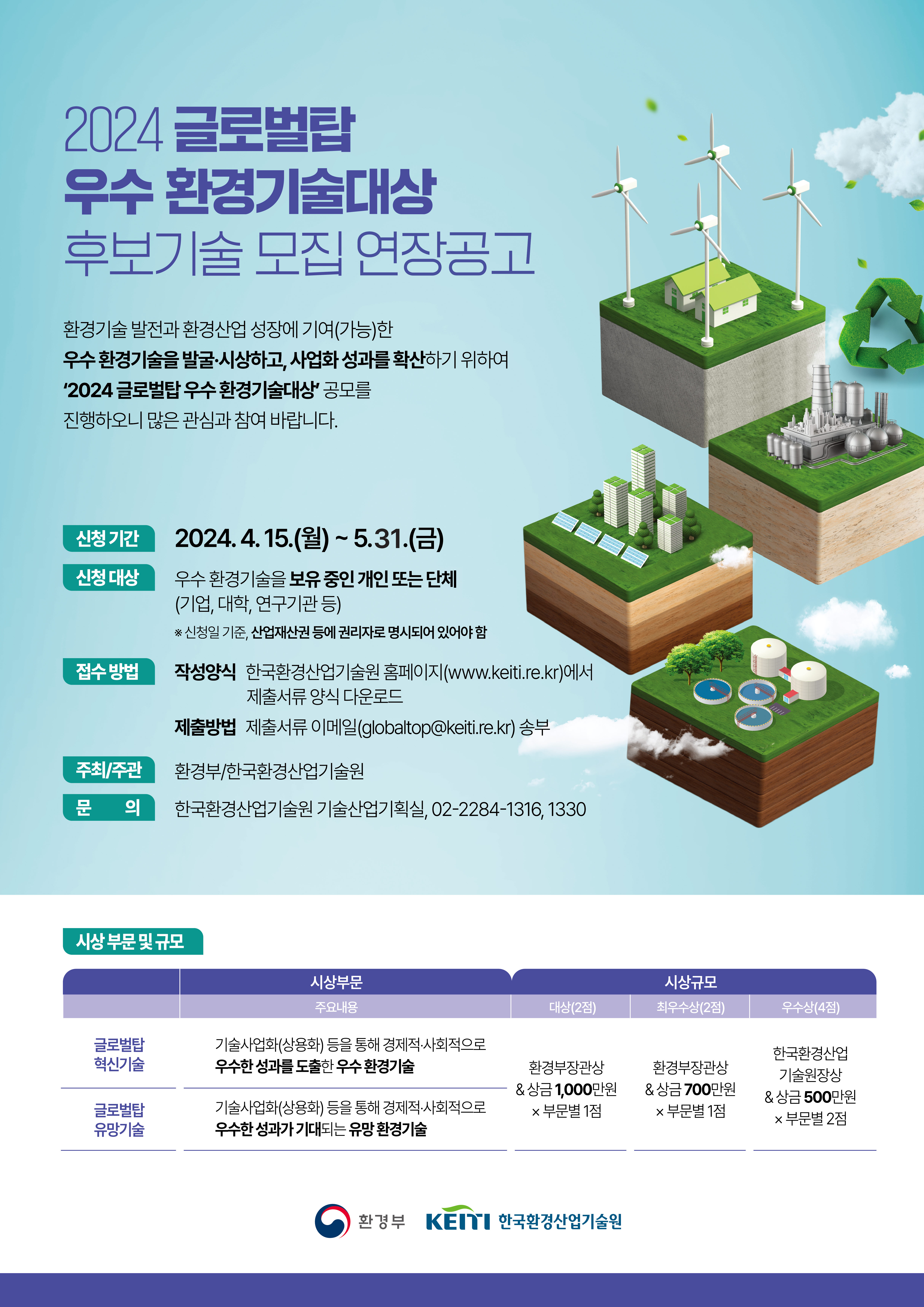 [환경부/한국환경산업기술원] '2024 글로벌탑 우수 환경기술대상' 공모 기간연장 안내