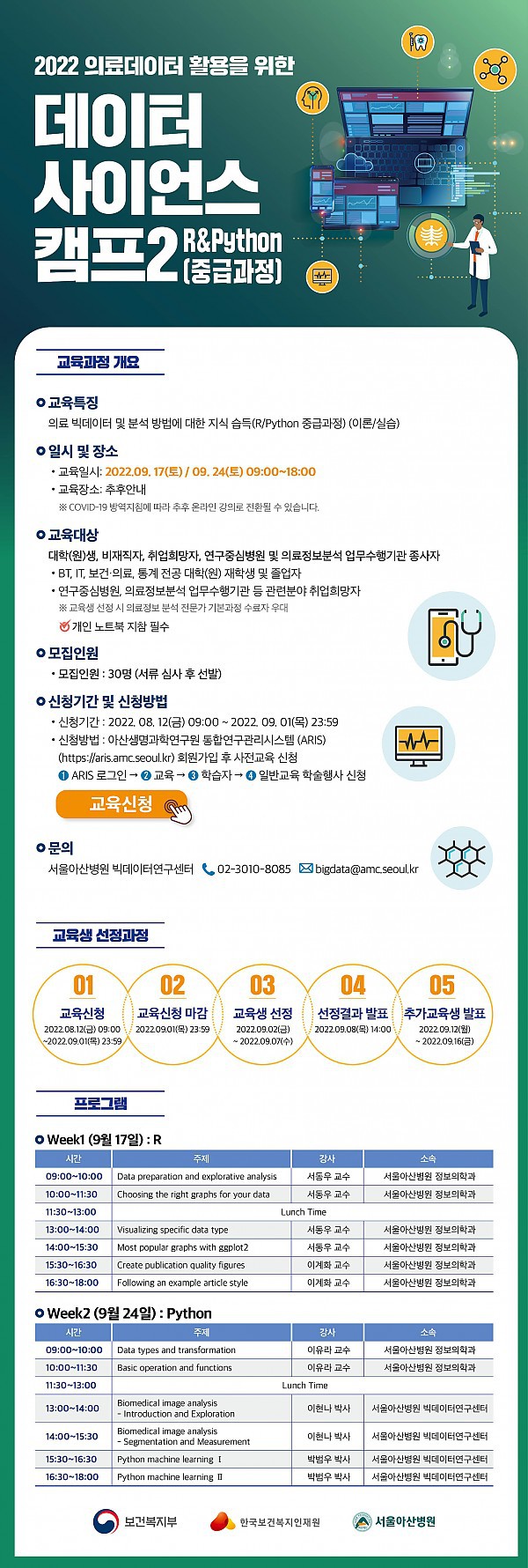 [안내] [서울아산병원 빅데이터연구센터]_2022 의료데이터 활용을 위한 데이터 사이언스캠프2 (R&Python) 중급과정