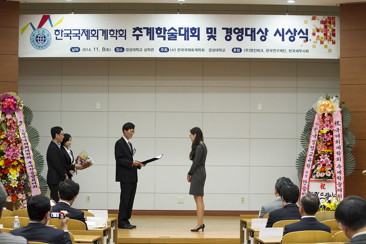 안녕하십니까? 지난 11월 8일(토) 경성대학교에서 열린 2014년 한국국제회계학회 추계학술대회 및 경영대상 시상식이 성황리에 개최되었습니다. 이번 학회는 170명이 넘는 회원님들이 참석하셔서 45의 논문을 발표해 주셨습니다. 바쁘신 와중에도 먼 길을 마다하지 않으시고 참석해 주신 회원분들과 멀리서 관심 가져주신 모든 분들께 감사드립니다. 앞으로도 학회발전을 위해 많은 관심 부탁드립니다.