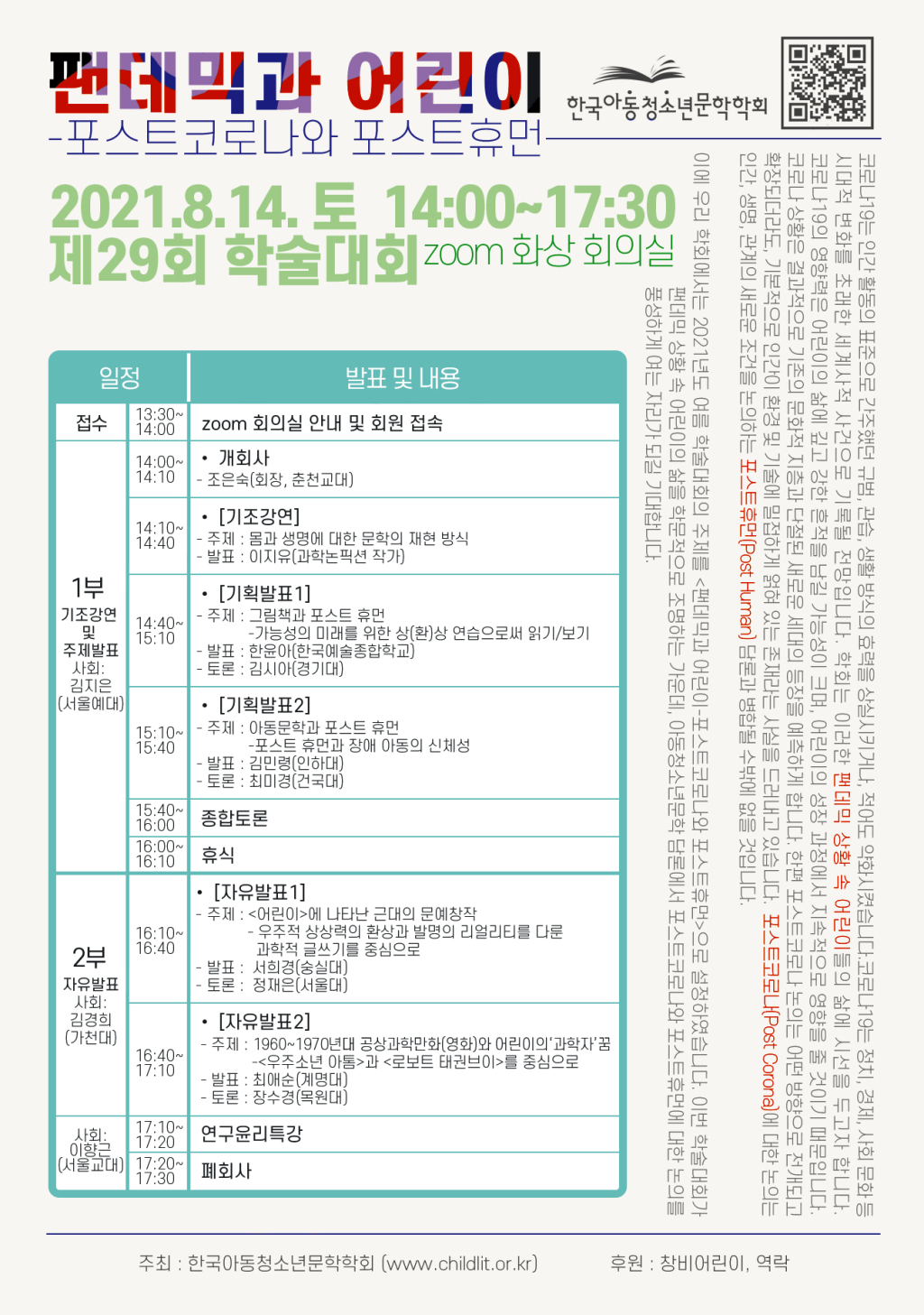한국아동청소년문학학회 제29회 8월 학술대회를 안내드립니다.