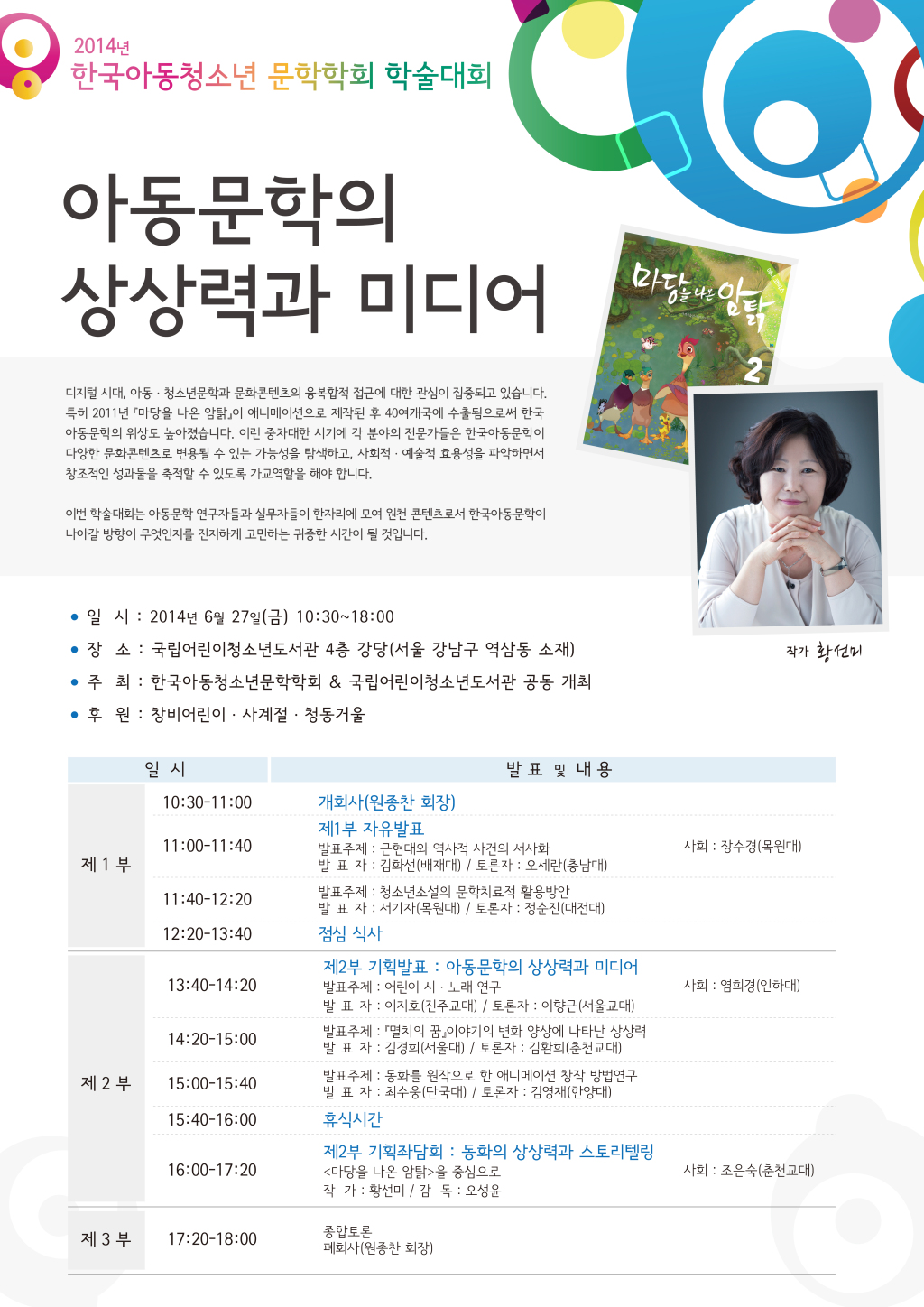 디지털 시대, 아동ㆍ청소년문학과 문화콘텐츠의 융복합적 접근에 대한 관심이 집중되고 있습니다. 특히 2011년 마당을 나온 암닭이 애니메이션으로 제작된 후 40여개국에 수출됨으로써 한국 아동문학의 위상도 높아졌습니다. 이런 중차대한 시기에 각 분야의 전문가들은 한국아동문학이 다양한 문화콘텐츠로 변용될 수 있는 가능성을 탐색하고, 사회적ㆍ예술적 효용성을 파악하면서 창조적인 성과물을 축적할 수 있도록 가교역할을 해야 합니다.