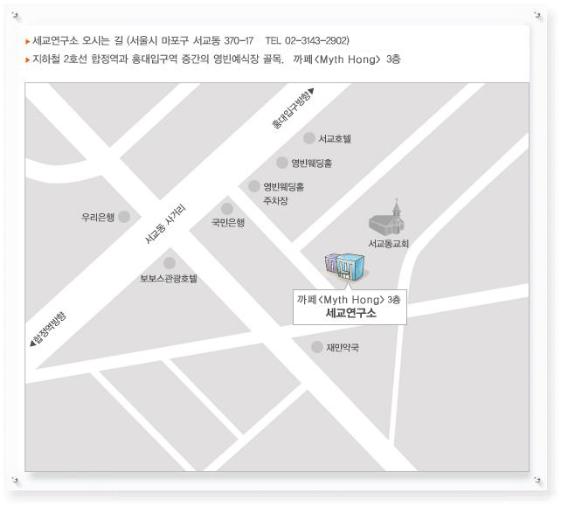 ※ 영빈웨딩홀과 국민은행 사이의 골목으로 들어와 직진하셔서 까페 <myth 弘> 건물을 찾으세요. 세교연구소는 3층에 있습니다.
