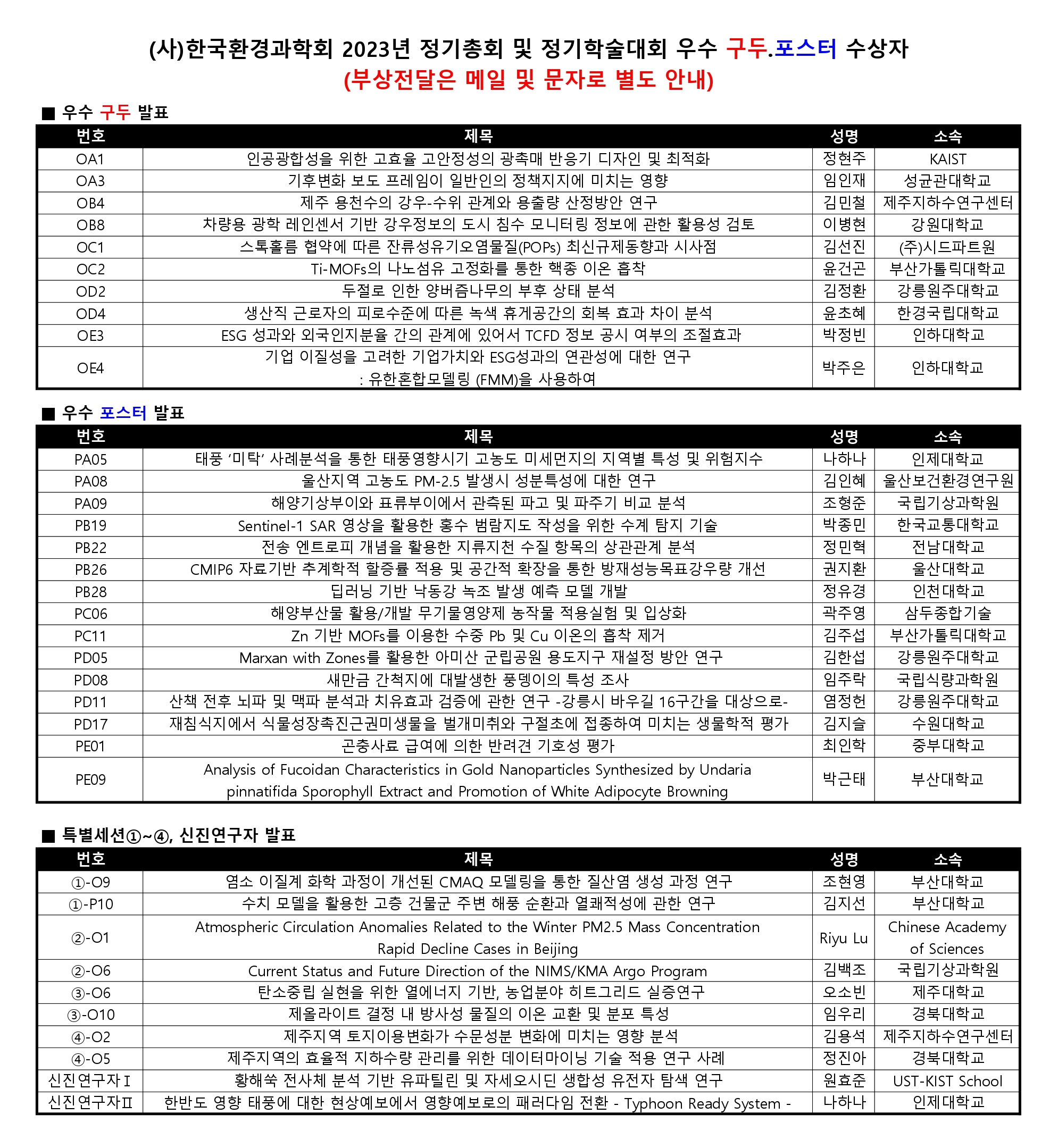2023년 정기학술대회 우수구두,포스터 수상자 안내