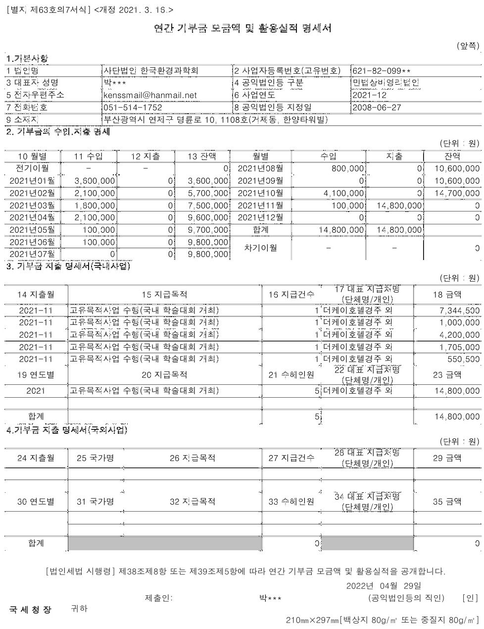 2021년 연간 기부금 모금액 및 활용실적 명세서