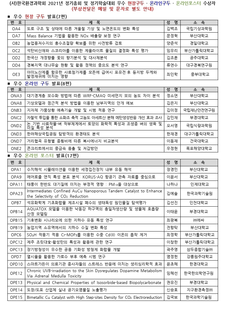 2021년 정기학술대회 우수구두,포스터 수상자 안내