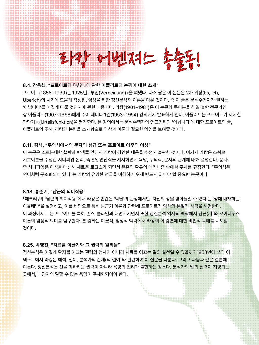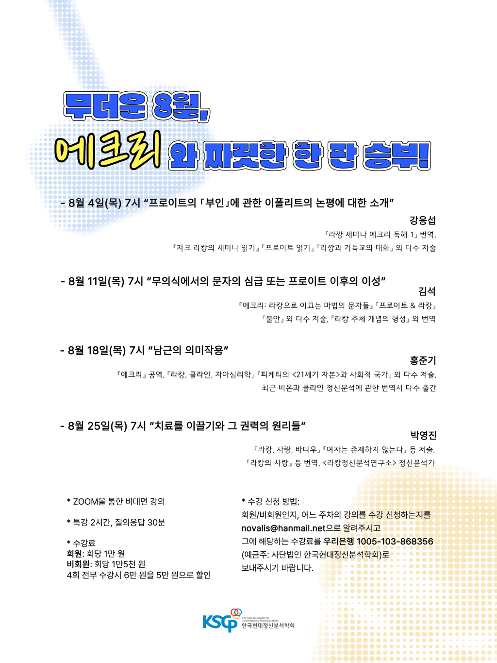 한국현대정신분석학회 사회사업위원회가 기획한 <에크리> 특강은 시리즈가 끝날 때까지 신청을 받는다는 점을 알려드리고자 합니다.