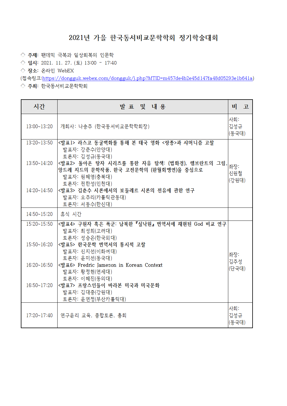 이번 학술대회는 비대면으로 개최되며, 온라인 링크는 다음과 같습니다. 회원분들의 많은 관심과 참여 부탁드립니다.