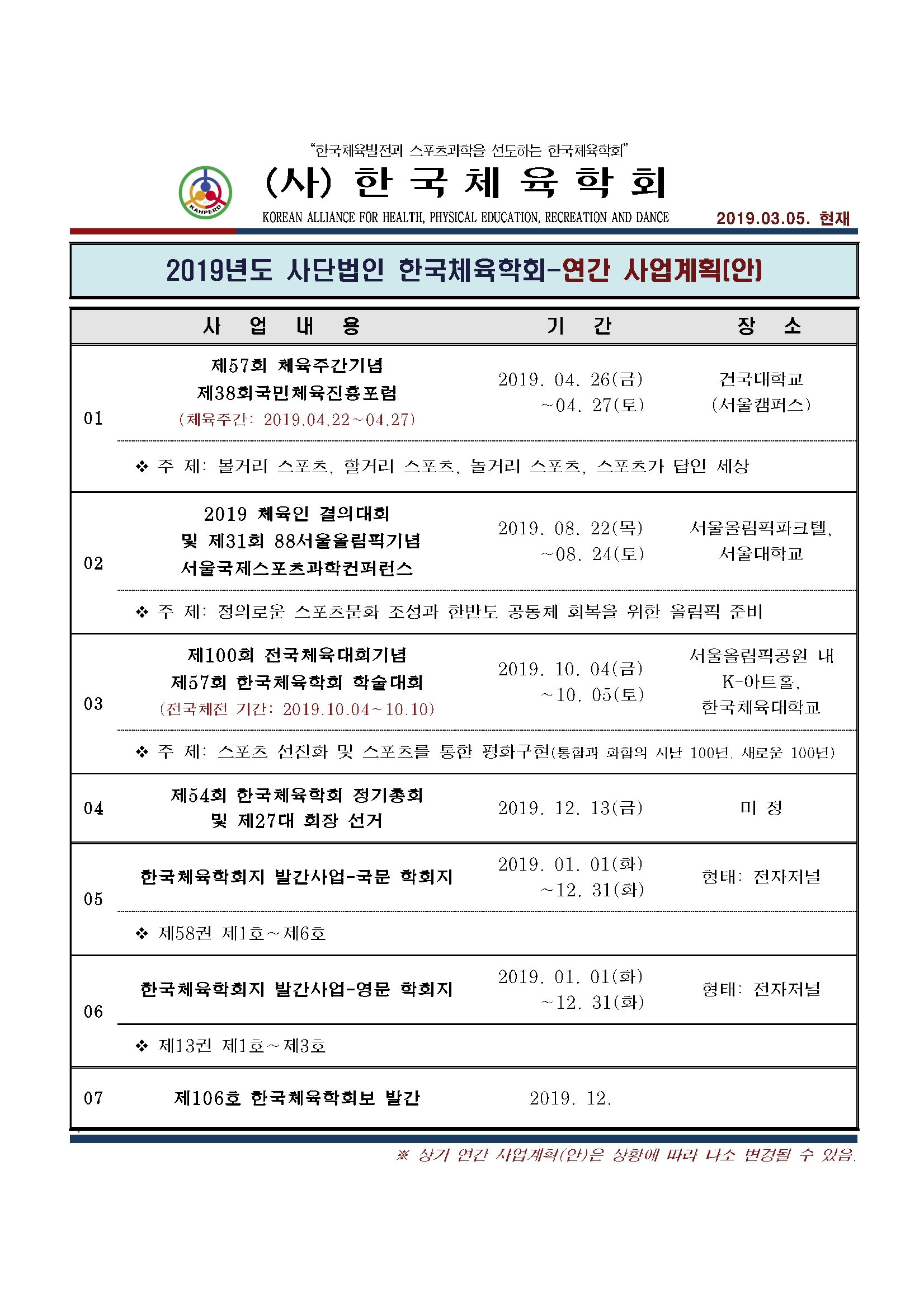 2019년 한국체육학회 연간 사업계획(안) 안내