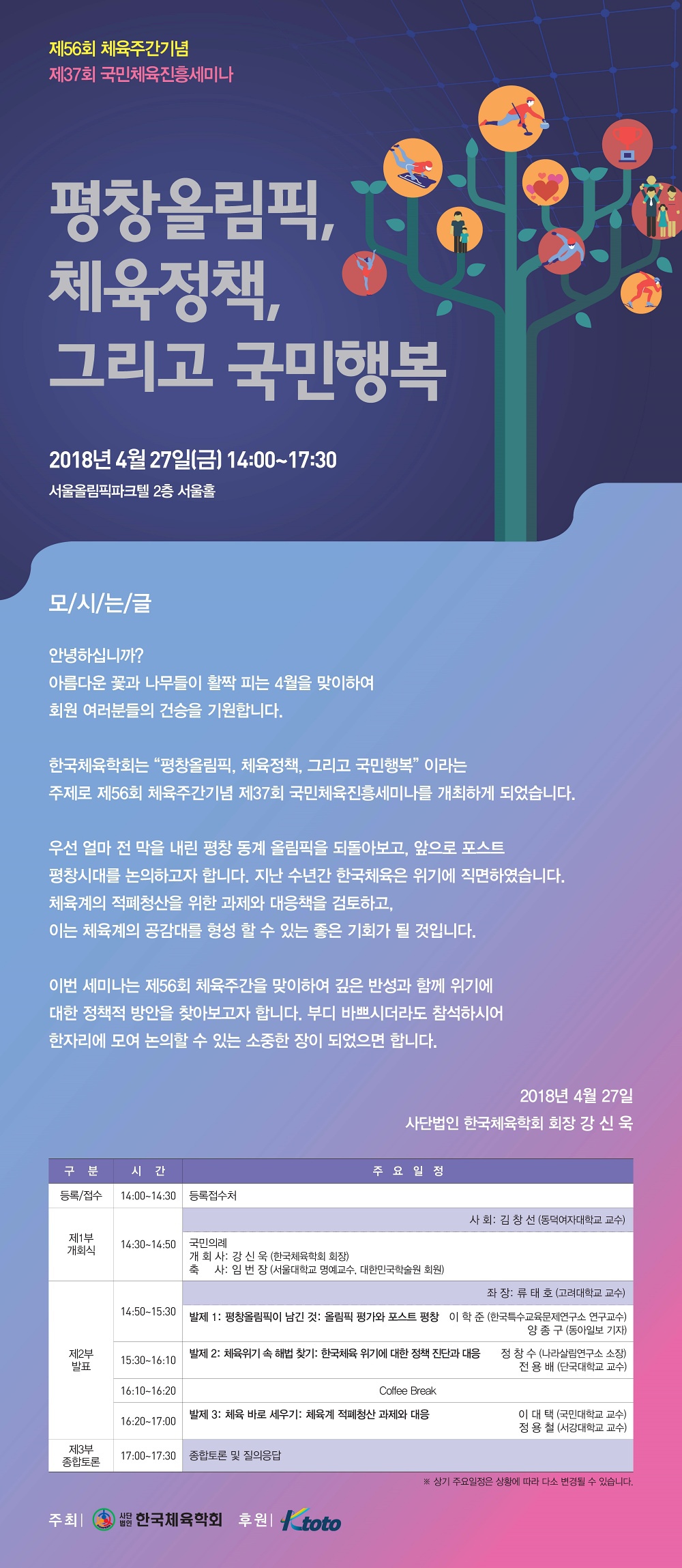 한국체육학회에서 다음과 같이 제56회 체육주간기념 국민체육진흥세미나를 개최합니다.