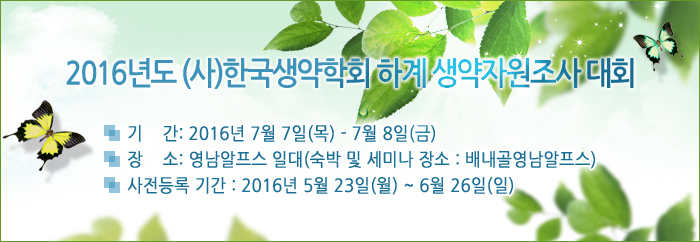 | 존경하는 한국생약학회 회원 여러분, 안녕하십니까, 지난 4월 28일 서울대 호암교수회관에서 열린 춘계심포지엄은 회원님들의 많은 관심과 적극적인 참여 속에 진지한 강연과 토론으로 진행되어 성황리에 잘 마무리되었습니다. 물심양면으로 성원해주신 회원님들께 이번 심포지엄 행사를 기획하고 준비한 저희 실무운영진과 함께 다시 한 번 깊이 감사드립니다. 아울러, 올해 7월 7일~8일 배내골 영남알프스에서 개최되는 하계생약자원조사대회 행사에 회원님들을 초대하고자 합니다. 이번 생약자원 조사대회는 영남알프스 천황산 일대에 자생하는 약용식물자원에 관한 학술세미나 및 천황산 사자봉 코스의 생약자원조사 일정을 포함하여, 한국생약학회 정회원님들과 대학원생 및 학부생 등 학문후속세대간의 유대관계를 돈독하게 다질 수 있는 즐겁고도 유익한 현장학습 행사로 이틀간 진행될 예정입니다. 영남알프스에서 진행되는 이번 하계생약자원조사대회 행사에도 회원님들의 많은 관심과 성원, 그리고 적극적인 참여를 부탁드립니다. 감사합니다. |